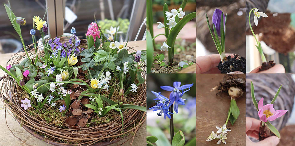 スイセンやクロッカス、ムスカリ、フリチラリア、プシュキニア、原種チューリップ……。 早春に咲く愛らしいラインナップの球根たちを16球も集めて咲かせる「球根の籠森」。今年開催4度目となる『ハンドル付きブリキの容器で作る「球根の籠森」(A・Bタイプ)』と、新デザインの『“鳥の巣風”球根で作る「私の森」(Cタイプ)』の2種のデザインのオンラインレッスンを2月15日(日)に開催します。
