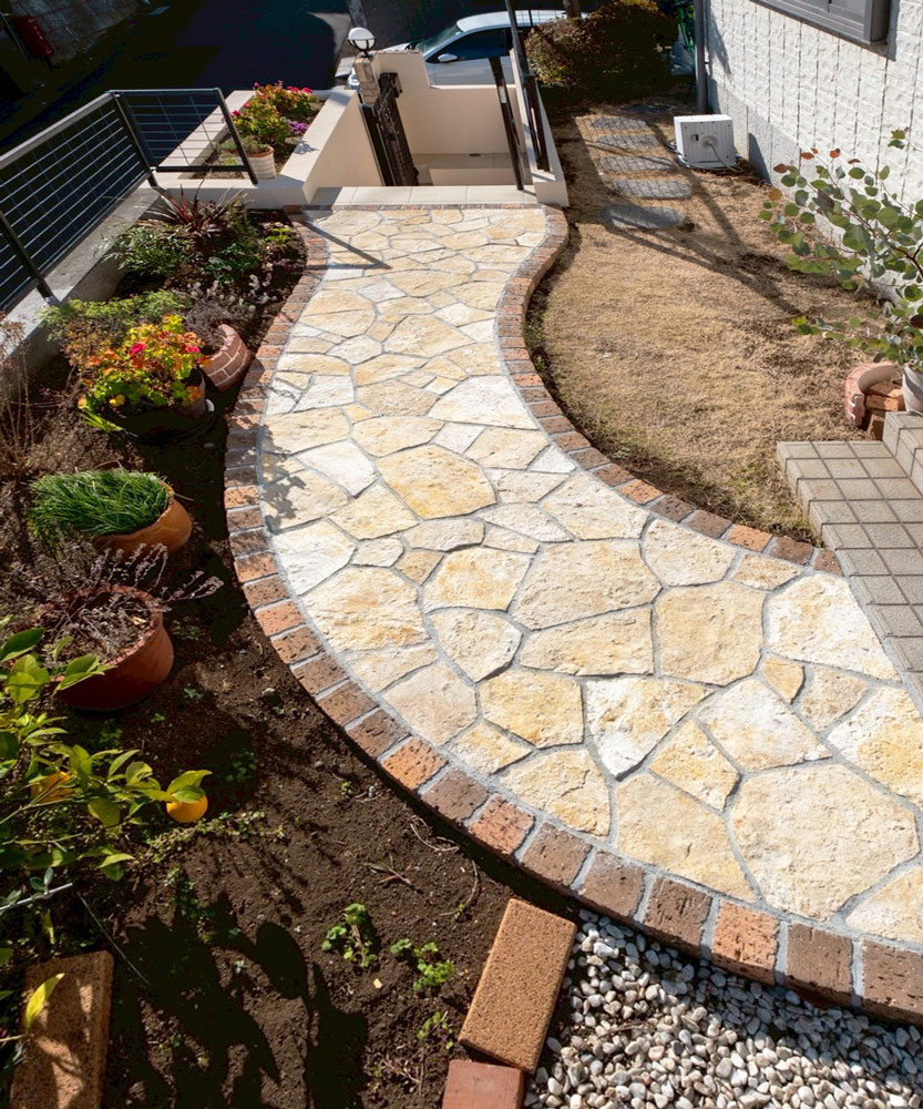 曲線×乱形石のアプローチで奥行きと遊び心をプラス
