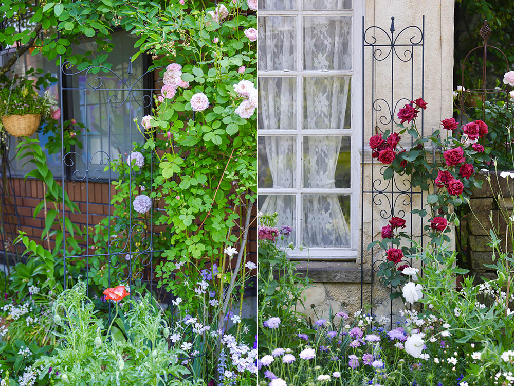 ① つるバラやクレマチスなど、つる植物の枝を絡ませるサポートとして用います。立体的に植物を仕立てられるため、小さな庭やバルコニーなどスペースがない場所でも豊かな花と緑の景色が作れます。