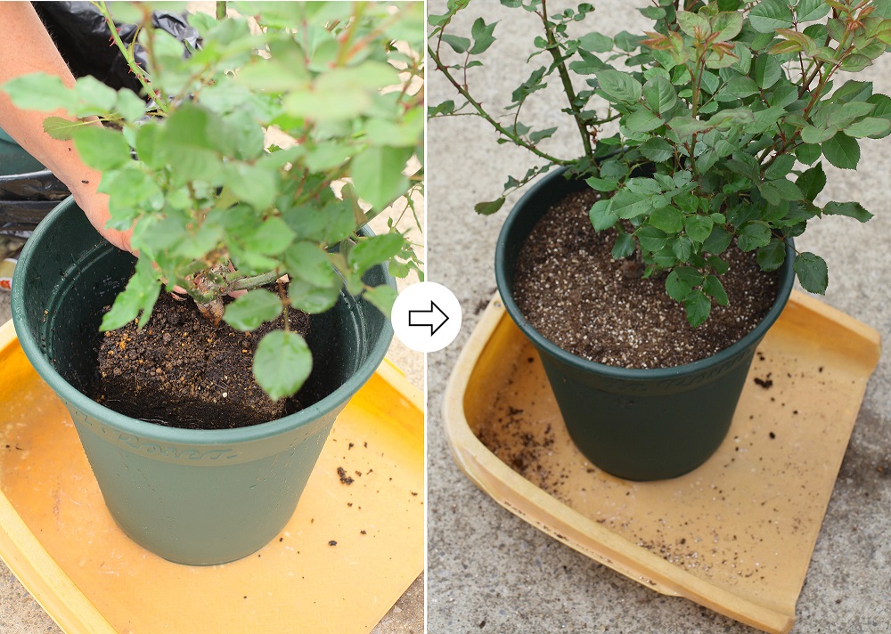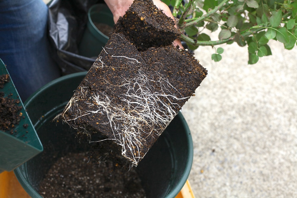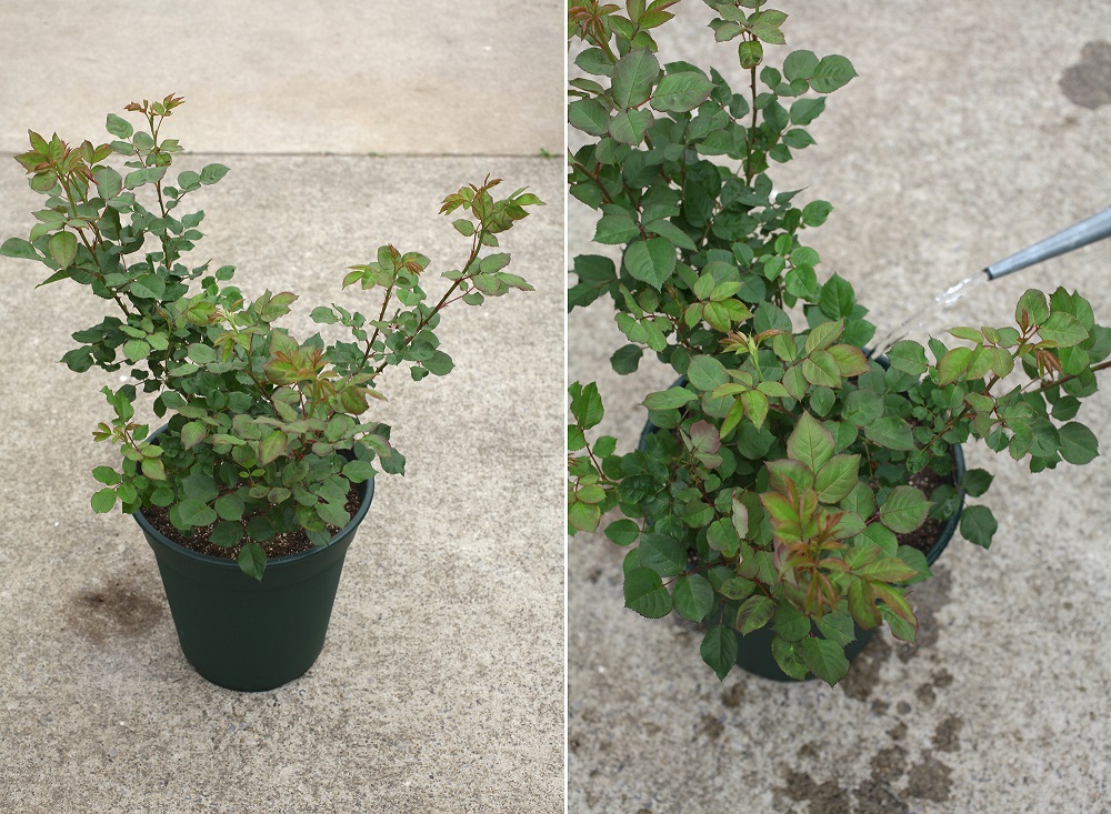 春から初夏にかけて、成長期にあるバラの鉢植え苗を購入したら、まずは植え付けを行います。「鉢に入っているから」と安心して、購入したままの状態で育てる人もいますが、これはNG。鉢植え苗の鉢は、購入後に運びやすいよう株に比べて小さなサイズになっていることが多く、そのままでは少し根が成長すると、すぐに根詰まりしてしまうなど、順調に生育しない恐れがあります。また、季節が進むにつれ気温が高くなり、水を多く必要とする初夏以降は、鉢が小さいと水切れしやすいという難点も。これらのことを防ぐためにも、バラの鉢植え苗を購入したら、まずは新たな鉢へと植え替えましょう。