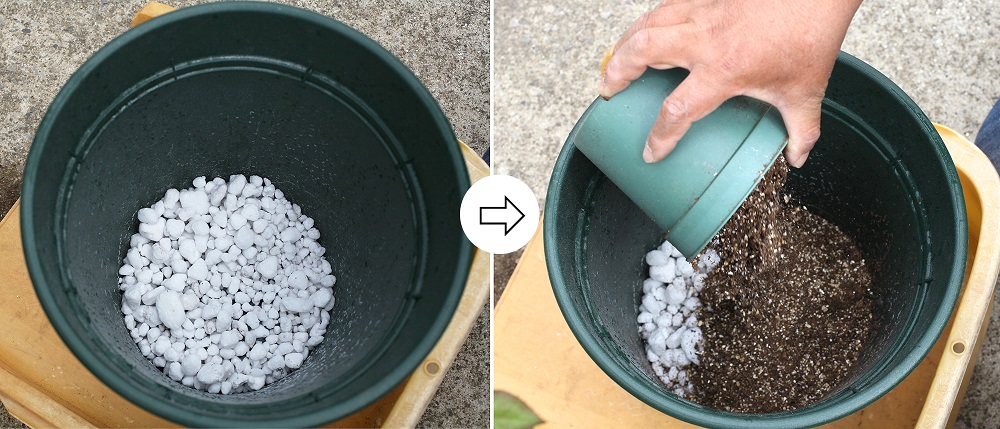 1.用意した植木鉢に、鉢底石を底が見えない程度に敷き、その上に培養土を入れます。培養土を入れる際には、鉢土の表面が鉢の縁の3~5cmほど下にくるよう、根鉢の大きさを考えながら入れます。