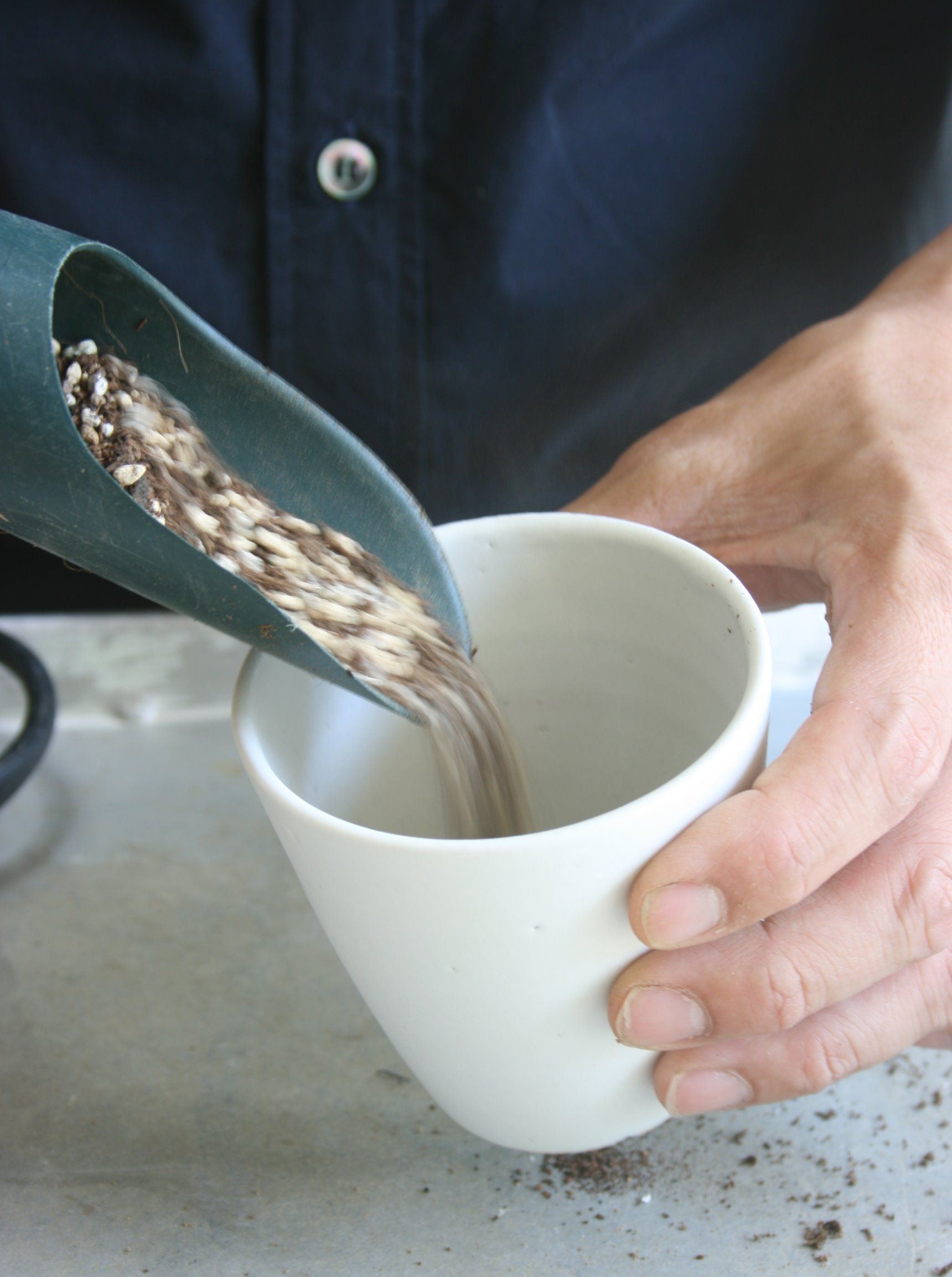 園芸店などで販売されている多肉植物用の土を使います。大切なのは「乾いた土」であること。土が濡れていると、バクテリアが繁殖しやすく、切れた根などから入り込む危険性があるからです。