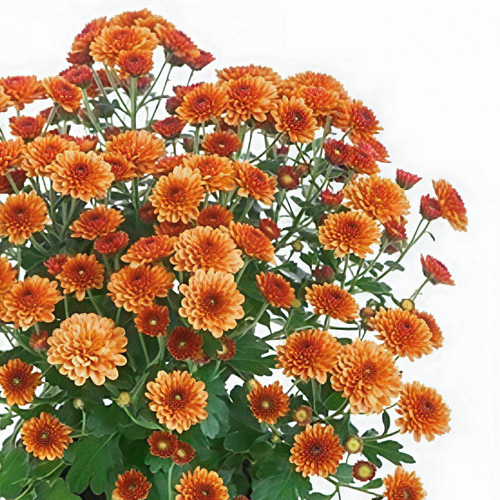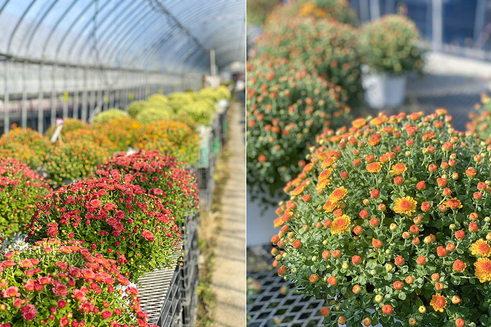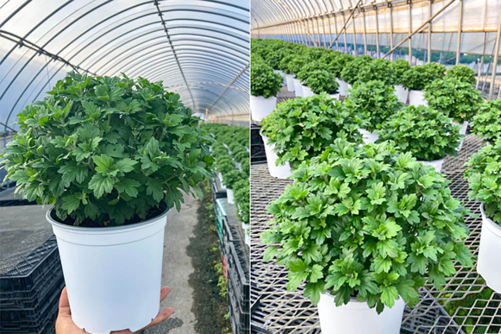 ガーデンマムは8月中旬から10月下旬までの間にぐんぐん成長します。その生育期間の早い段階で植え替えることで、株が1〜2回り大きく成長し、その分、花数もいっぱい増えるのです。「平田ナーセリー」ではつぼみがまだ小さく、葉っぱが豊富に茂った生育初期の良株を揃えています。購入後はぜひ植え替えをして、株を大きく育てて花いっぱいの秋を楽しんでください。花数を増やすには、花が咲いているものより下写真のような緑の株がおすすめです。