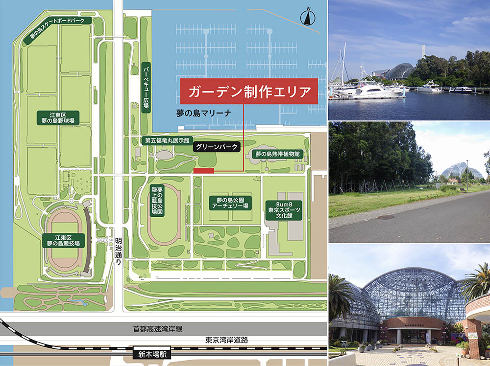 コンテストの舞台となる東京都江東区にある夢の島公園は都心から近く、東京湾に浮かぶような立地の都立公園です。 かつてのごみの埋め立て地を緑豊かな海辺の公園へと変貌させた「都市再生のモデル」となる公園でもあります。 園内にはユーカリ、デイゴ、ヤシなど熱帯・亜熱帯植物が生育し、熱帯植物館やスポーツ施設、マリーナ、広大な 芝生広場を備え、訪れる人々に南国リゾートの雰囲気を感じさせてくれます。