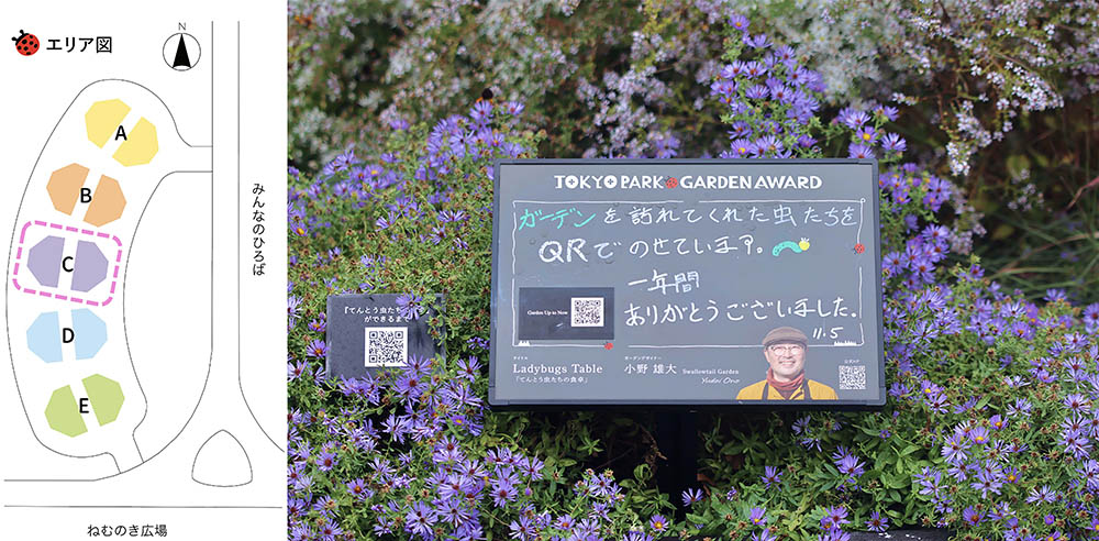 子どもたちの遊び場であり、天気のよい日には老若男女が思い思いに過ごす場所。そんな“日常の延長にある公園”の中で、ガーデンを「眺める」「触れる」、時には「花や葉を持ち帰る」など、さまざまな行動を通して、人と人、生き物、植物、微生物が自然に交わる世界を表現したいと考えました。宿根草の花色や種類の配置、低木との高低差などを工夫することで、2つの花壇でありながら統一感と自然な広がりを両立した空間を表現することができました。それぞれの植物の特性を活かしながら、ナチュラルな景観を形成できたと感じています。また、「生き物との共生」をテーマの一つとして掲げ、普遍的なチョウやウグイスなどの小鳥だけでなく、オオセイボウといった珍しい昆虫も観察され、多くの来園者に楽しんでいただけました。