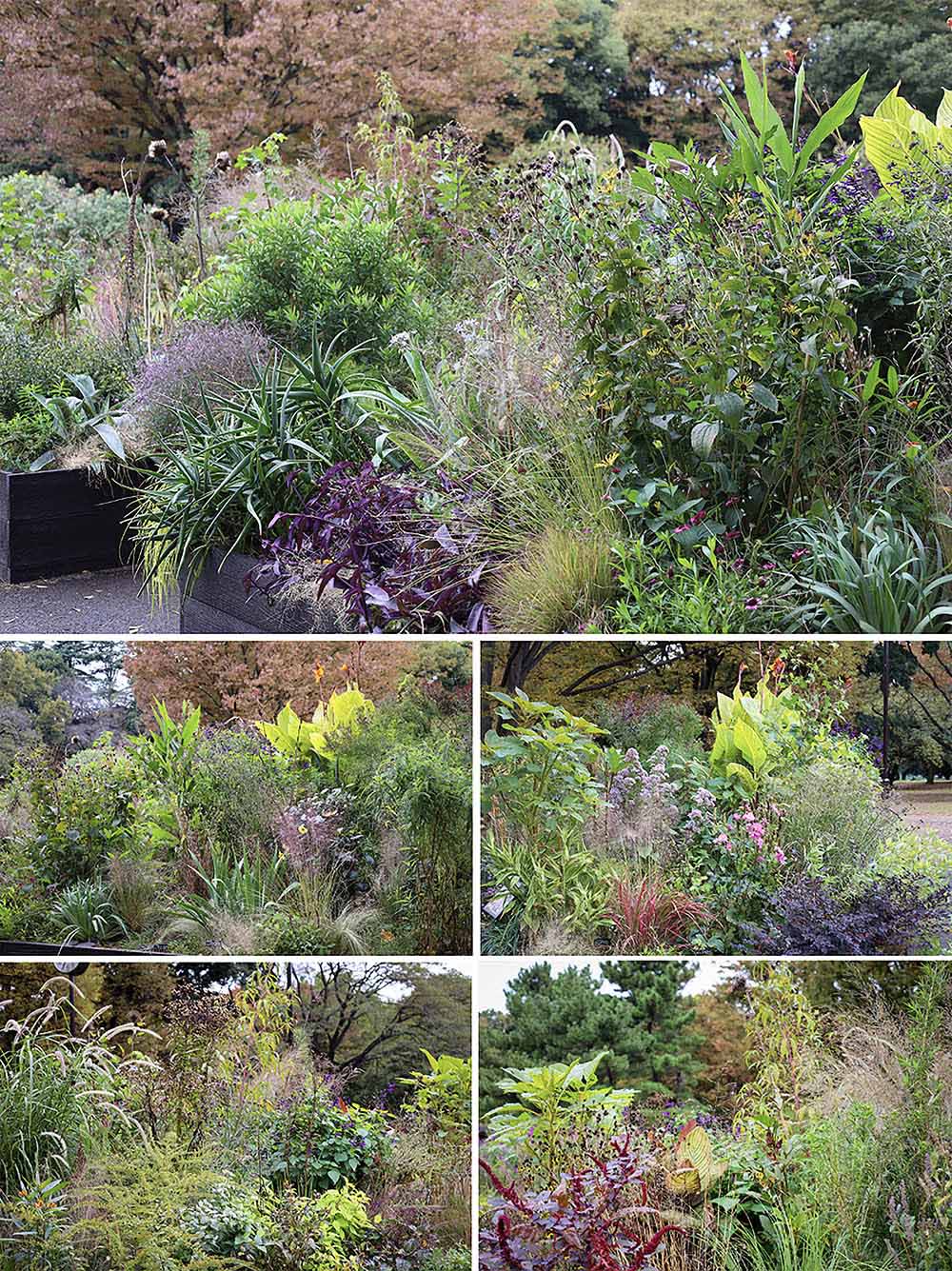 個性が際立つ植物を巧みに組み合わせ、まるでジャングルの中に入り込んだような感覚を味わえるガーデンでした。多種多様な植物を数多く使い、植物の可能性をとことん追及したカラフルでダイナミックな植栽デザインが特徴的で、その圧倒的な色彩の豊かさが多くの来園者の目を惹きつけていました。花壇の多角形を生かし、見る角度によって、構築的で造形的におもしろい植物、質感のバラエティ豊かな組み合わせ、多彩に変化する色合いなどを楽しめる点が印象的でした。遠くから見ても植物たちの存在感が力強く、厳しかった今夏を乗り越えた姿には感動を覚えます。写真を撮りたくなるシーンが随所に散りばめられ、見る人を自然と滞留させる魅力に富んだガーデンでした。