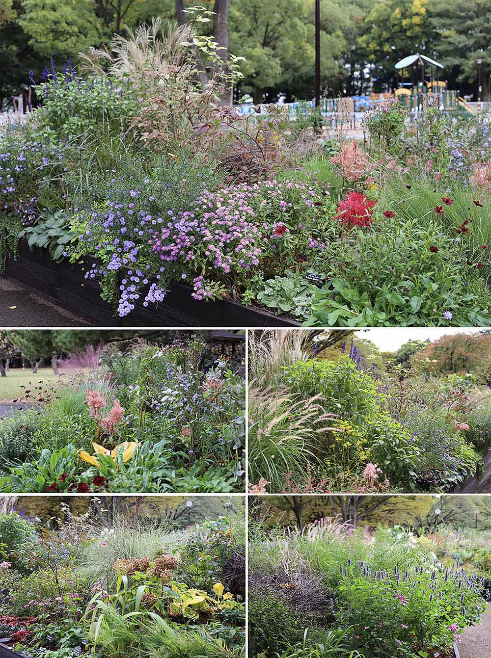 イチゴやイチジクなど、自分の庭に取り入れたくなるカジュアルな提案がたくさん詰まった庭でした。見ているうちに「美味しそう!」と感じ、ガーデンの先にある家族の物語まで想像させてくれます。剪定枝で作った可愛いサークルネストなど、子どもと一緒に楽しめそうな工夫も魅力的です。植栽デザインは年間を通して全体の色合いが美しく、コーナーごとに設けられたテーマカラーをぐるりと一周しながら眺める楽しみがありました。特に秋には、黄・オレンジなど暖色系の構成から、目を転じるとアスターなどの寒色系へと色調が変化する眺めが絵画のようでした。季節ごとに多彩なシーンを提供してくれ、幅広い世代の来園者が訪れる砧公園という場所にふさわしい、元気をもらえるガーデンでした。