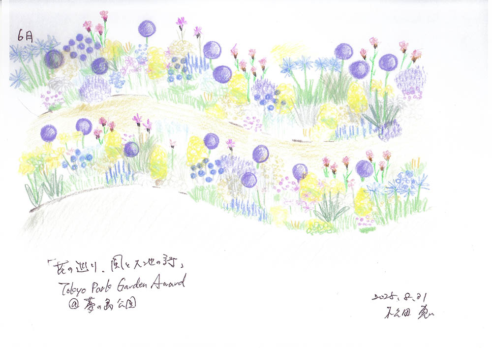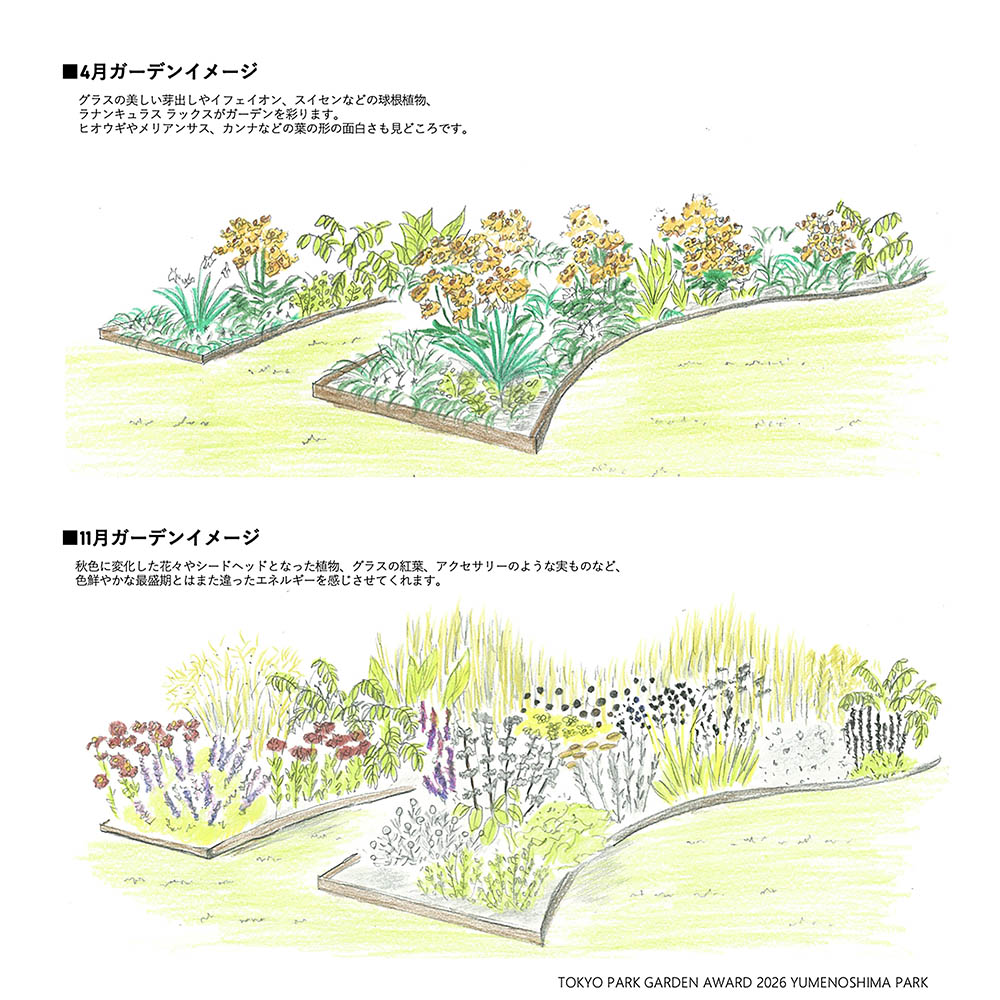 植物を単なる装飾に限らず、この地固有の「環境を翻訳する存在」と捉え、来園者が海風・光・湿度・熱といった目に見えない環境を感覚・知覚できる場をつくります。「東京サバンナ」は景観的なサバンナの模倣ではなく、夢の島の歴史と環境条件から必然的に現れた都市の新しい風景です。都市と自然の狭間に生まれたこの庭を通じて、来園者が環境や植物との関わりを見つめ直し、都市園芸の新たな可能性を感じ取るきっかけとなることを願います。そしてこのガーデンが、見た目の美しさと維持のしやすさを兼ね備えた、持続可能な宿根草ガーデンの新しいスタンダードとして育まれれば幸いです。
