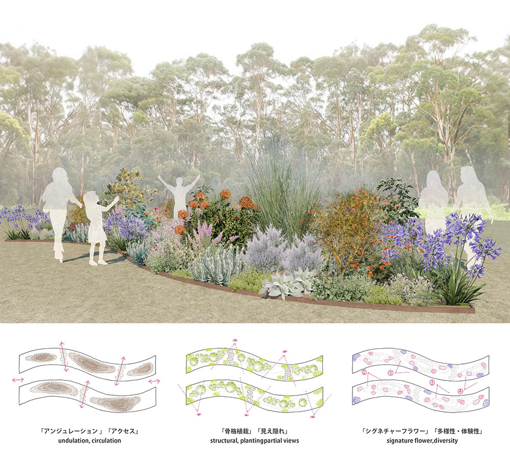 今回ガーデンが設けられるエリアは、『夢の島熱帯植物館』西側のグリーンパークの一画で、公園のシンボルであるユーカリの樹林地に面しています。広がる波をイメージした2本のウェーブガーデン(約24㎡)に、海辺の環境に適した宿根草を植栽。背景のユーカリとも調和する、ロングライフ・ローメンテナンスなガーデンが制作されます。2025年12月、土壌改良から作庭が行われ、11月の最終審査を迎えるまで、必要に応じてメンテナンスを実施。近年の激しい気候変動、とくに厳しい酷暑への対応も重要な課題です。3回の審査を経てグランプリが決定するまで、さまざまな予測を立てながら庭と向き合っていくことになります。