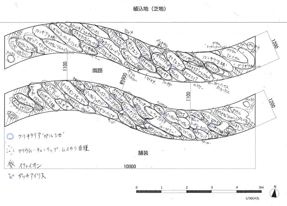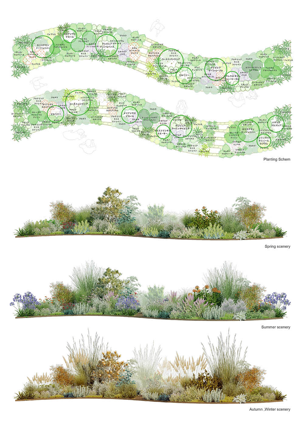 ・冬季に訪れる来園者にも配慮し、花後も景観を彩るグラスや常緑樹、カラーリーフ類を混植し、季節ごとに表情が変わり、秋冬も映えるガーデンとします。