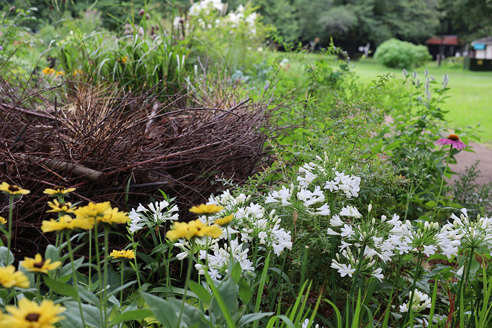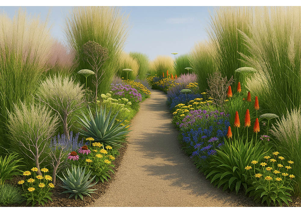 ・管理も容易なアガパンサス、エキナセア、グラス類や強剪定も可能な南半球由来の低木を視認性の高い要所(起伏の尾根やコーナー)に配置。マルチングやグランドカバーで乾燥防止と雑草抑制を図ります。