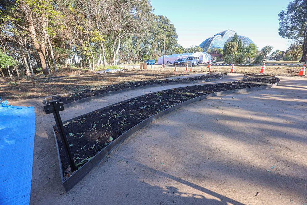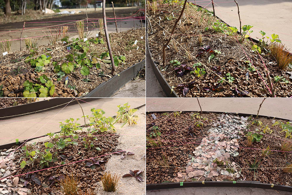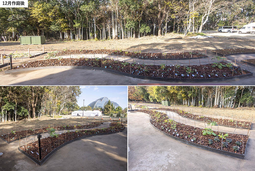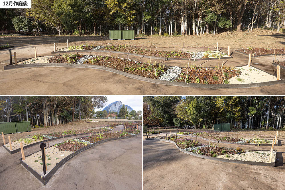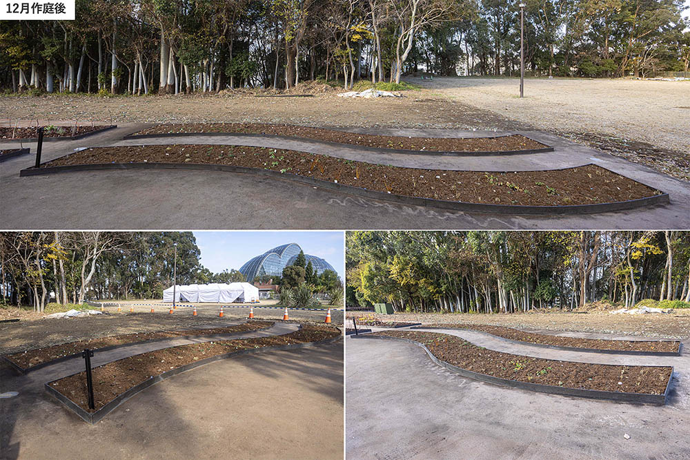 今回ガーデンが設けられるエリアは、『夢の島熱帯植物館』西側のグリーンパークの一画で、公園のシンボルであるユーカリの樹林地に面しています。広がる波をイメージした2本のウェーブガーデン(約24㎡)に、海辺の環境に適した宿根草を植栽。背景のユーカリとも調和する、ロングライフ・ローメンテナンスなガーデンが制作されます。2025年12月、土壌改良から作庭が行われ、11月の最終審査を迎えるまで、必要に応じてメンテナンスを実施。近年の激しい気候変動、とくに厳しい酷暑への対応も重要な課題です。3回の審査を経てグランプリが決定するまで、5名の入賞者はさまざまな予測を立てながら庭と向き合っていくことになります。