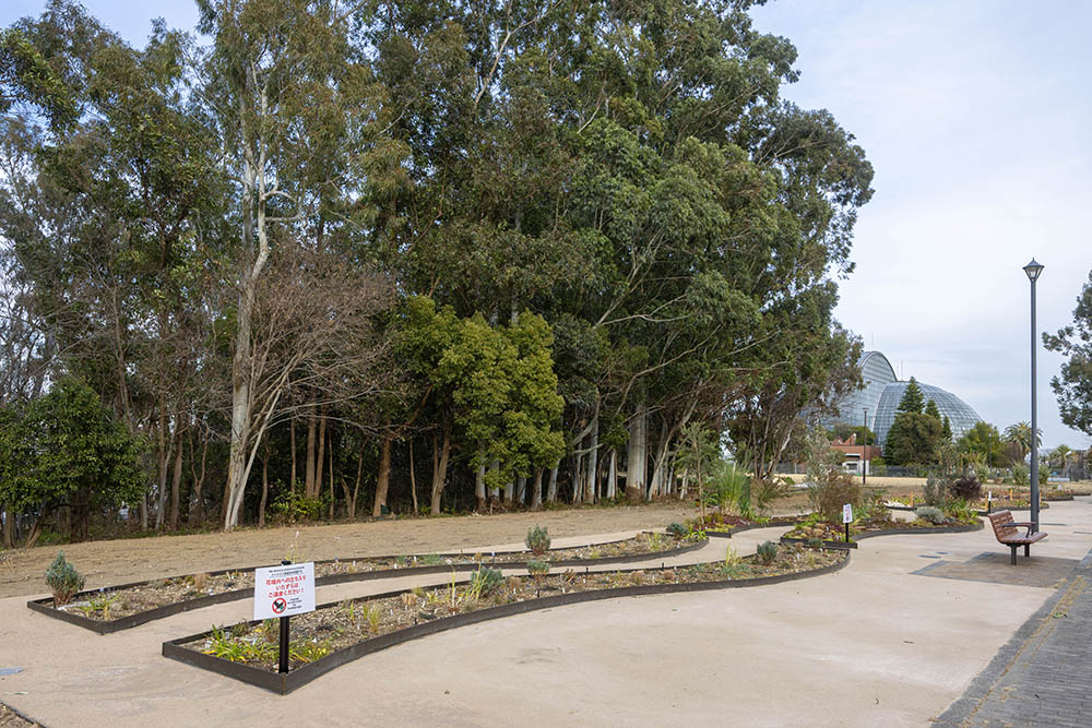 ・公園の象徴であるユーカリ林を主役に、遠くからは樹林の前景として眺める花壇、入り込めばユーカリの壁を借景に、緑に包まれる植栽空間を創出。背後の樹林と庭の植栽がつながるよう視線の抜けや緑の連続感を意識し、園全体との一体感を演出します。