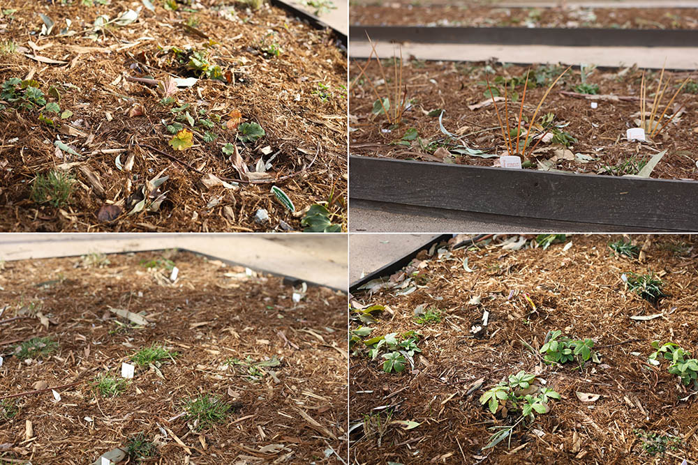 バーク堆肥でマルチングされたガーデンには、植物たちがまだまだぬくぬくと眠っているかのような静けさが広がっています。しかし表土をよく観察すると、小さな葉をのぞかせ始めた宿根草の姿があり、強い生命力が感じられます。これからどのような風景が描かれていくのか、まったく想像がつかないだけに、今後の成長への期待がいっそう高まります。