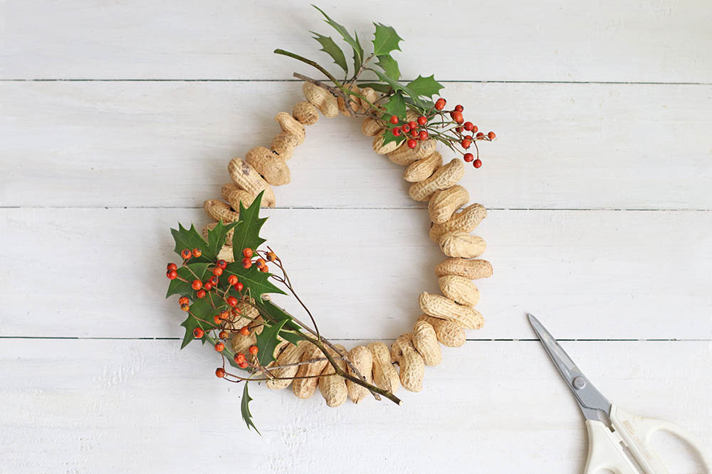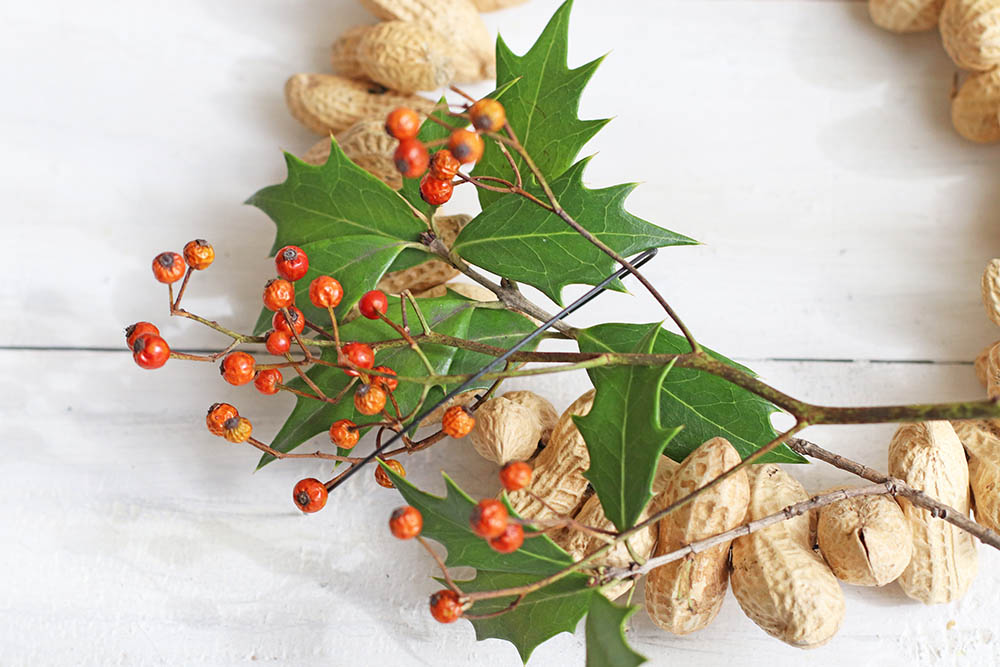 落花生リースの上に、ヒイラギと野バラの実を置いて、場所やバランスを確認します。