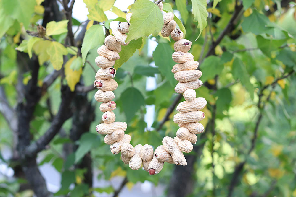 そしてピーナッツに、ハサミで穴をあけていきます。あとは外に飾っておくだけ。