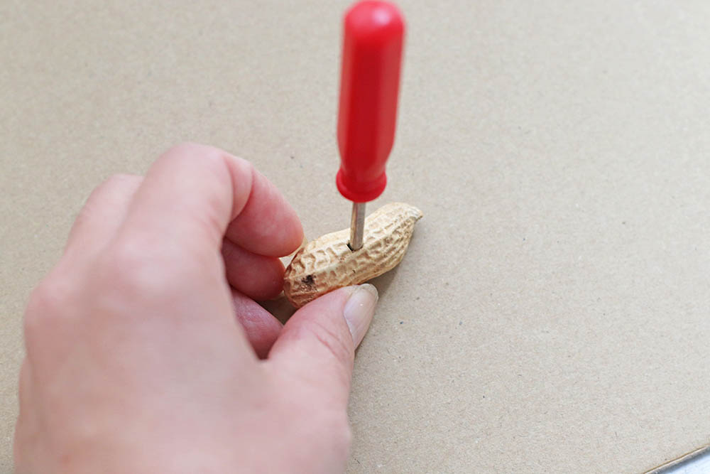 殻つき落花生の割れ目のない真ん中のあたりに、ドライバーで穴を開けます。このとき、下に厚紙や段ボールを敷いておくとよいでしょう。