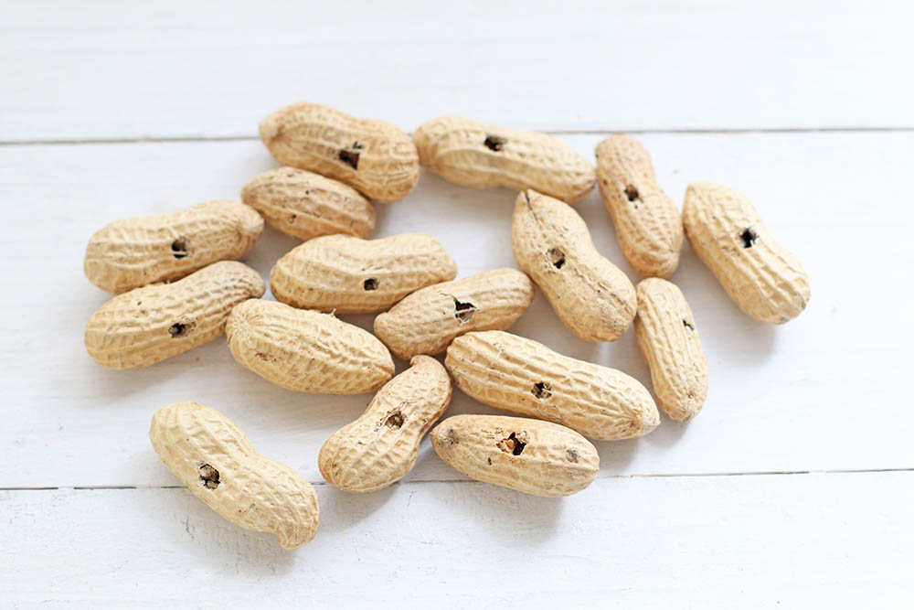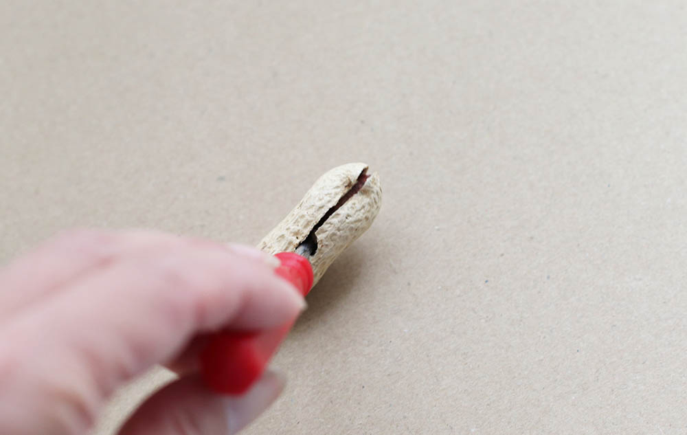 殻つき落花生の割れ目のところに穴をあけてしまうと、全体が割れて開いてしまうので、要注意です。