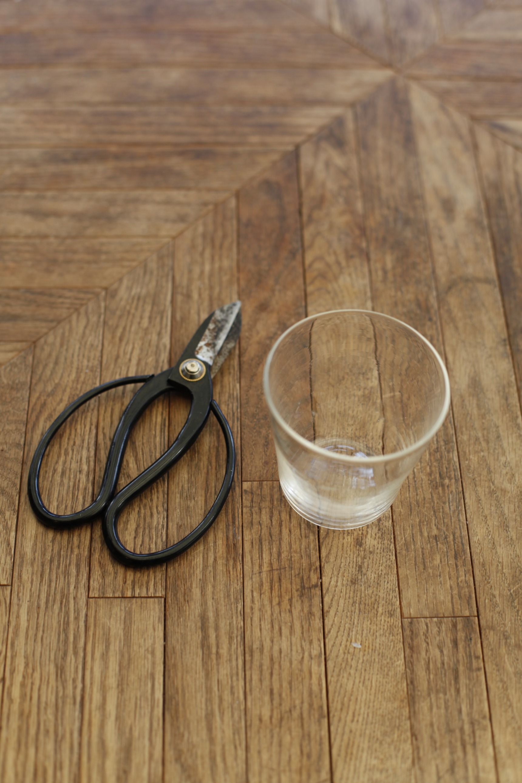 花をいけるとき、多くの人は「花瓶がないとダメ!」と思うようです。花束をいただいたのはいいけれど、花瓶がなくて困った、という話もよく聞きます。実際は、“水が漏れない器”さえあれば、花瓶がなくても花はいけられるのです。たとえば、どの家のキッチンにもあるガラスのコップ。これと花を切るハサミさえあれば、花を飾ることができます。