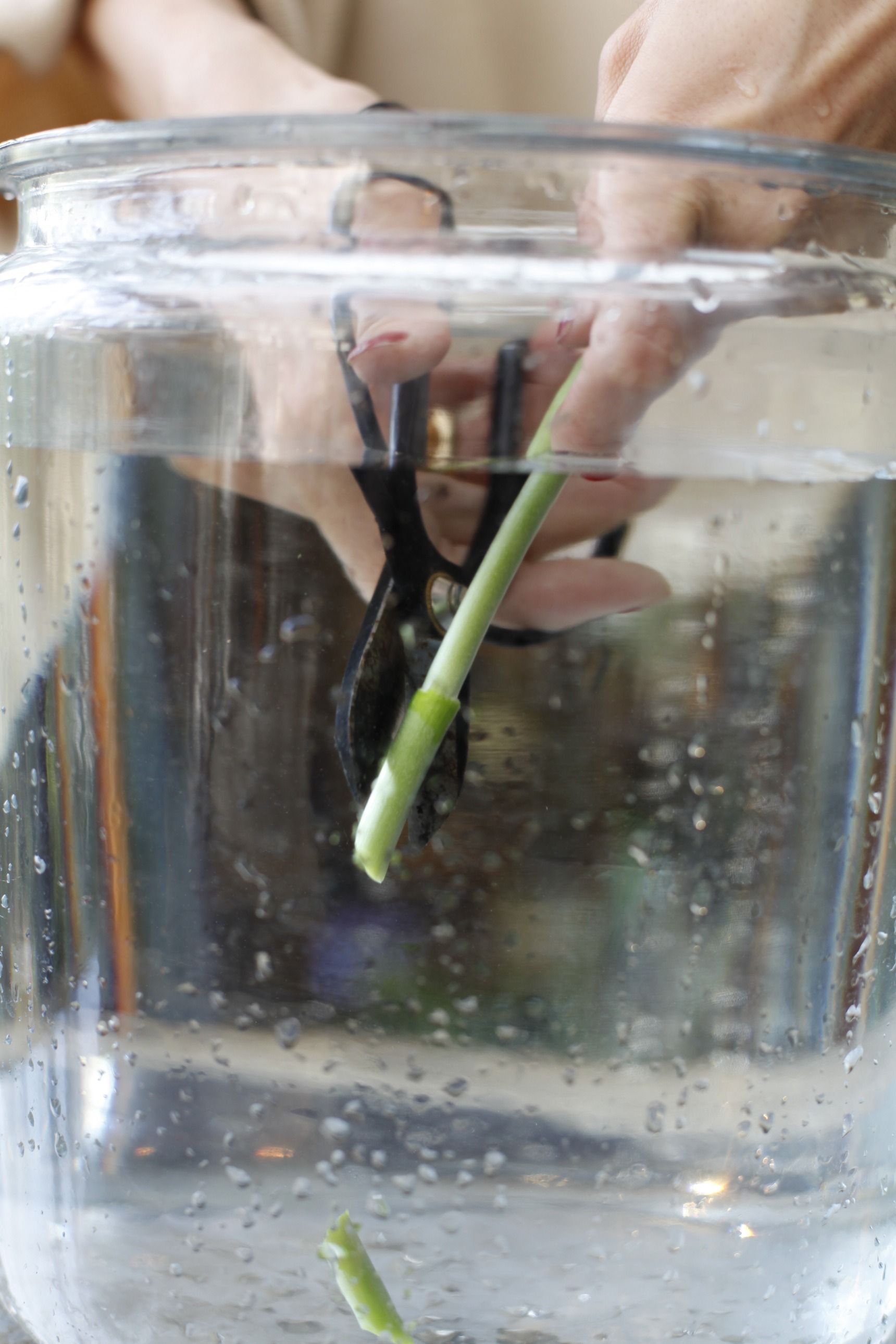 水切りの方法は簡単です。大きめのボウルや器に水をたっぷり入れます。その中に茎を入れて、ハサミで茎先をカットするだけ。カットする分量は、自分がいけたい長さによりますが、最低でも1~2㎝は切りましょう。このとき、切ってすぐ茎を水からあげないことがポイントです。短くても5分、できればそのまま1時間以上、茎を水につけておくと、水圧でより水が上がります。