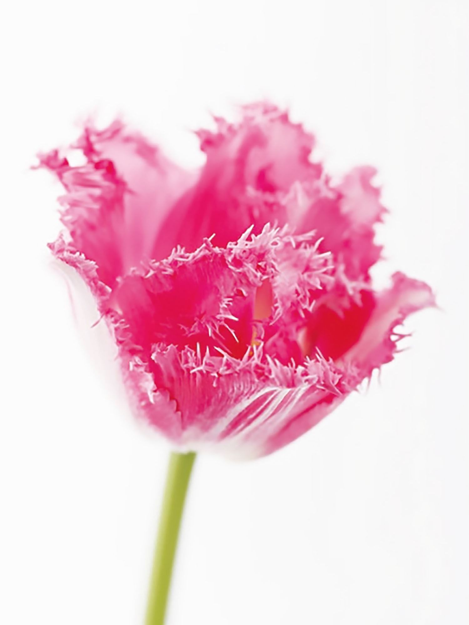チューリップの魅力のひとつは、長くてしなやかな茎。きれいな緑色をした、艶やかな茎の美しさを存分に見せたいので、茎はできるだけ長めにカットするといいですね。アレンジする前に、切りすぎてしまわないように注意しましょう。そうすると、日が経つにつれて光の方向に曲がっていく、茎のおもしろさも生きてきます。