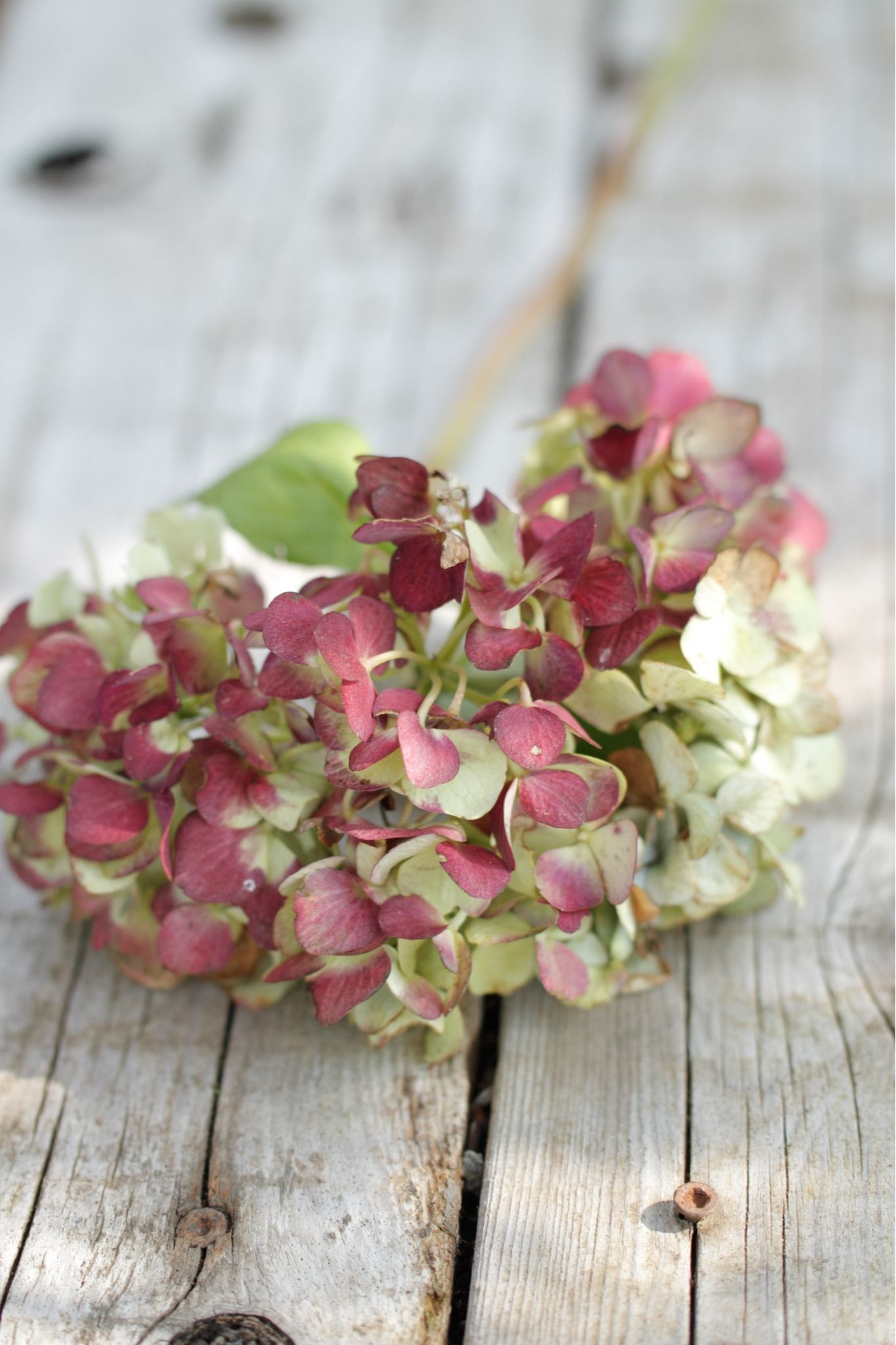 じつは「秋色アジサイ」という名前は“通称”。西洋アジサイやアナベルのなかで、秋に、くすんだニュアンスカラーに変化する品種の総称です。花びらが固く締まっているのが特徴。赤みや青みを帯びながら、ひと房の中に複雑な色合いが混じります。