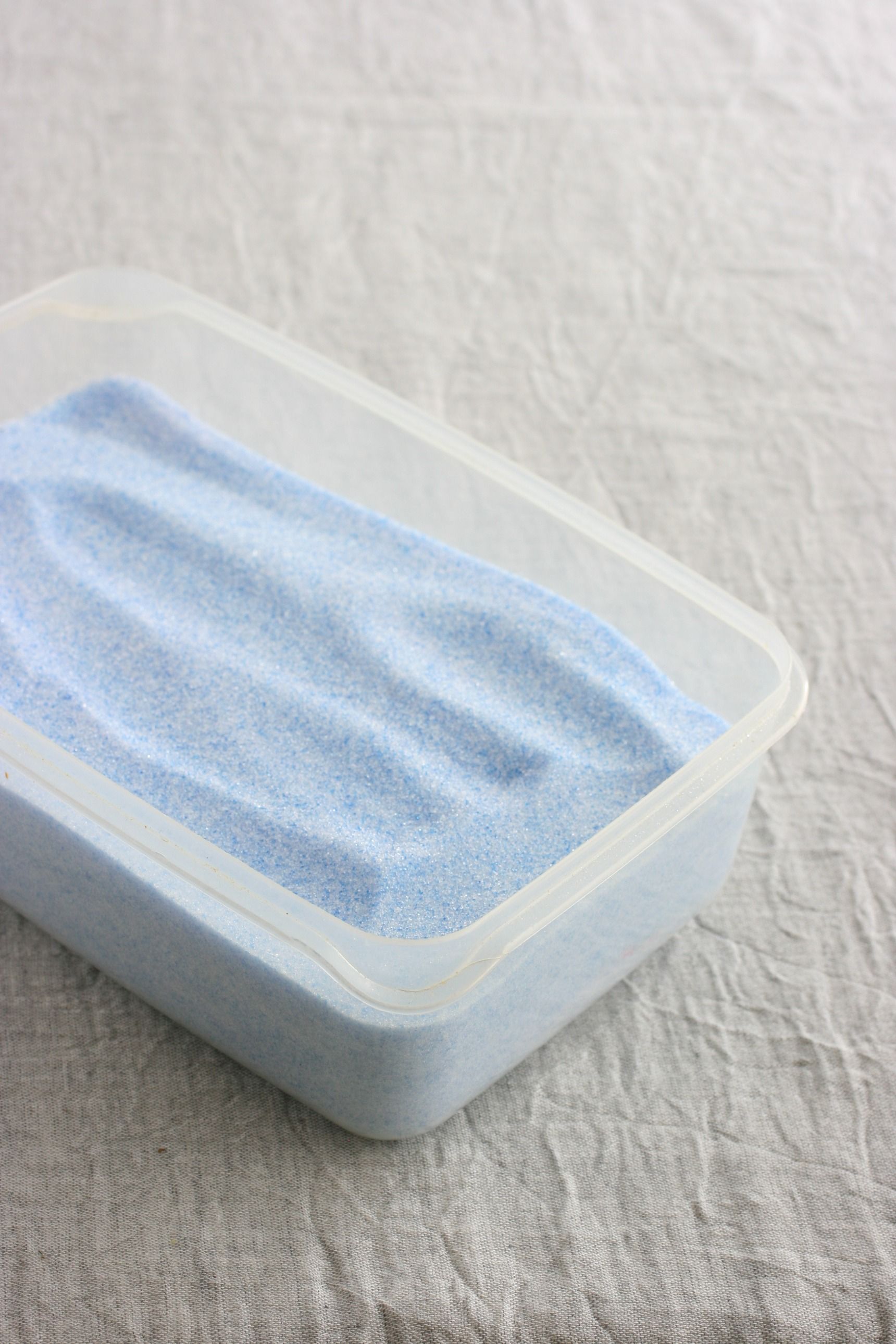 ① タッパーにシリカゲルを敷きます。目安は底から3㎝ほど。浅く、ムラのある状態では水分の吸着力が十分に働きません。