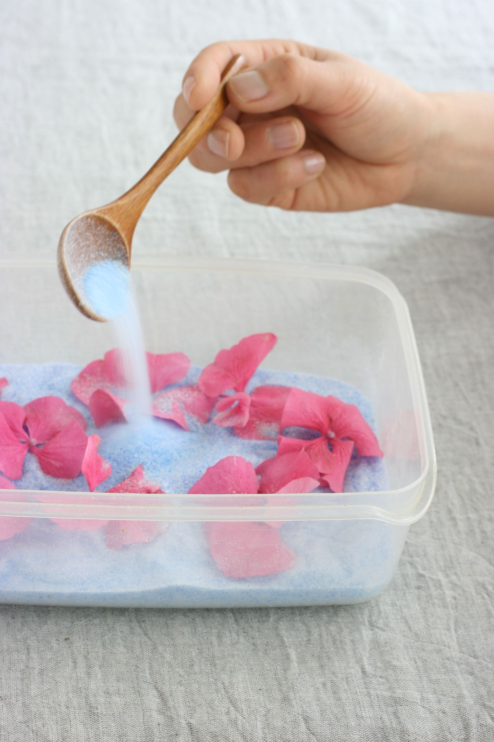 ③スプーンなどを使って、アジサイ(紫陽花)の上にシリカゲルをやさしくかけていきます。