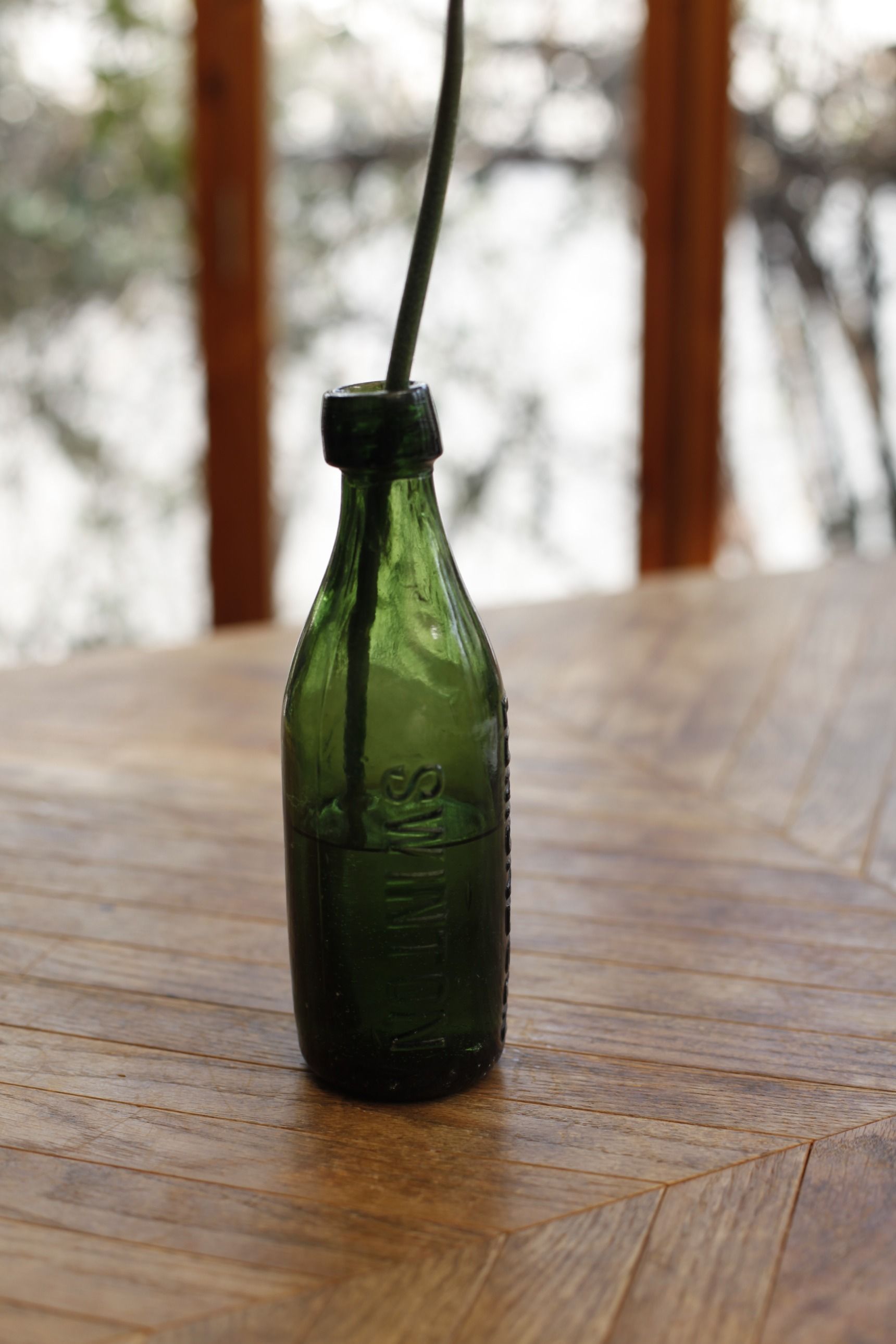 青い染料を吸わせた染めのガーベラを1輪だけ、色ガラスのボトルにいけました。たったこれだけのあしらいなのに、とても格好よく粋に見えるのは、花色と器の合わせ方にコツがあります。なるべくシックな色みのガーベラとボトルを選ぶこと。特に自然界にはない青のガーベラは、見る人にインパクトを与え、1輪でも印象的になります。
