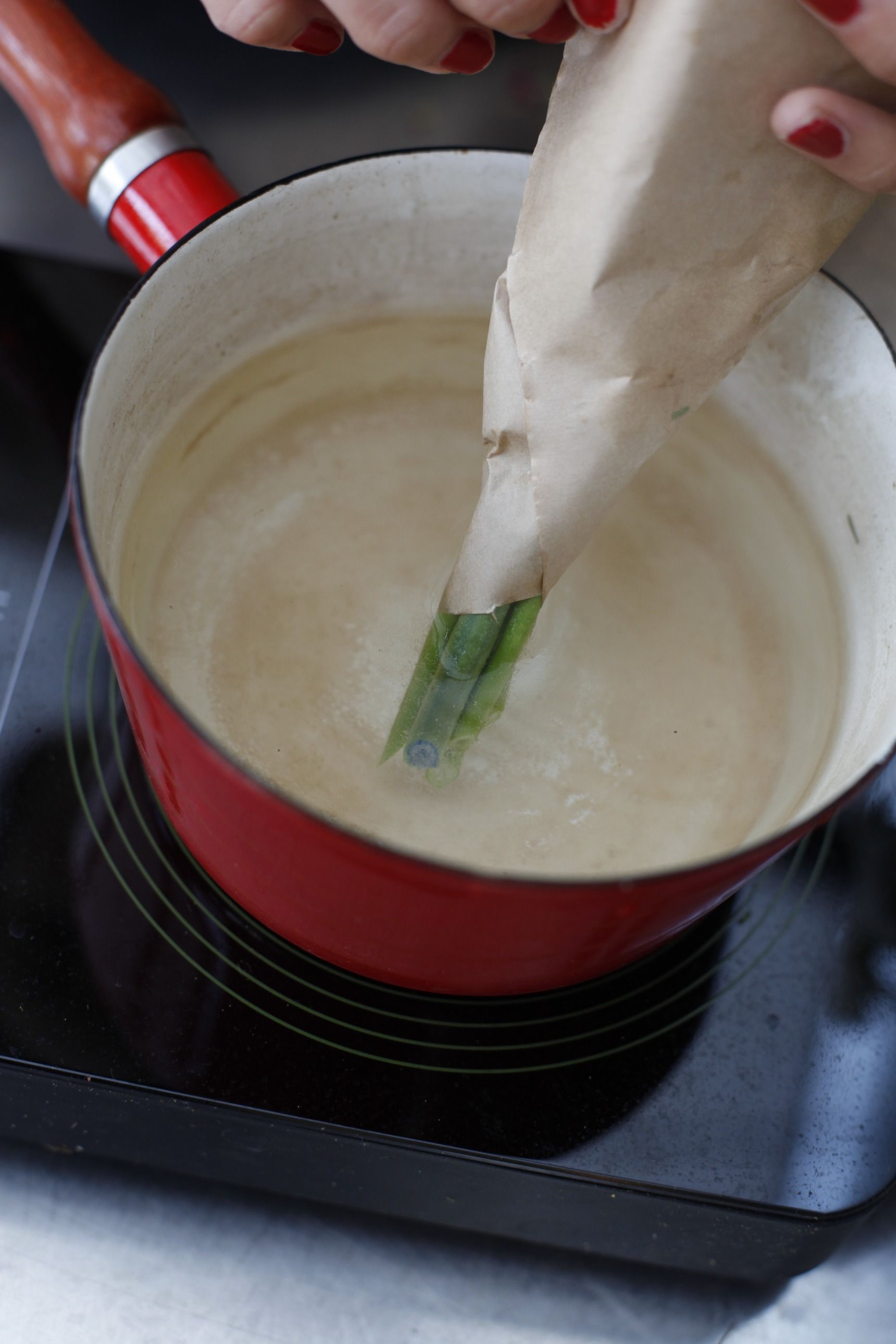 湯あげの方法は、茎先を10cmほど出して、花と茎をペーパーで包みます。これは花にお湯の熱気がかからないようにするため。ペーパーはなるべくきっちりとすき間なく巻いて、セロハンテープで留めてください。このまま茎先3~4cmほどを、熱湯に10~20秒ほど浸し、すぐにたっぷりの水につけます。できれば1時間ほど茎を水につけたままにしておくと、さらに水がよく上がります。