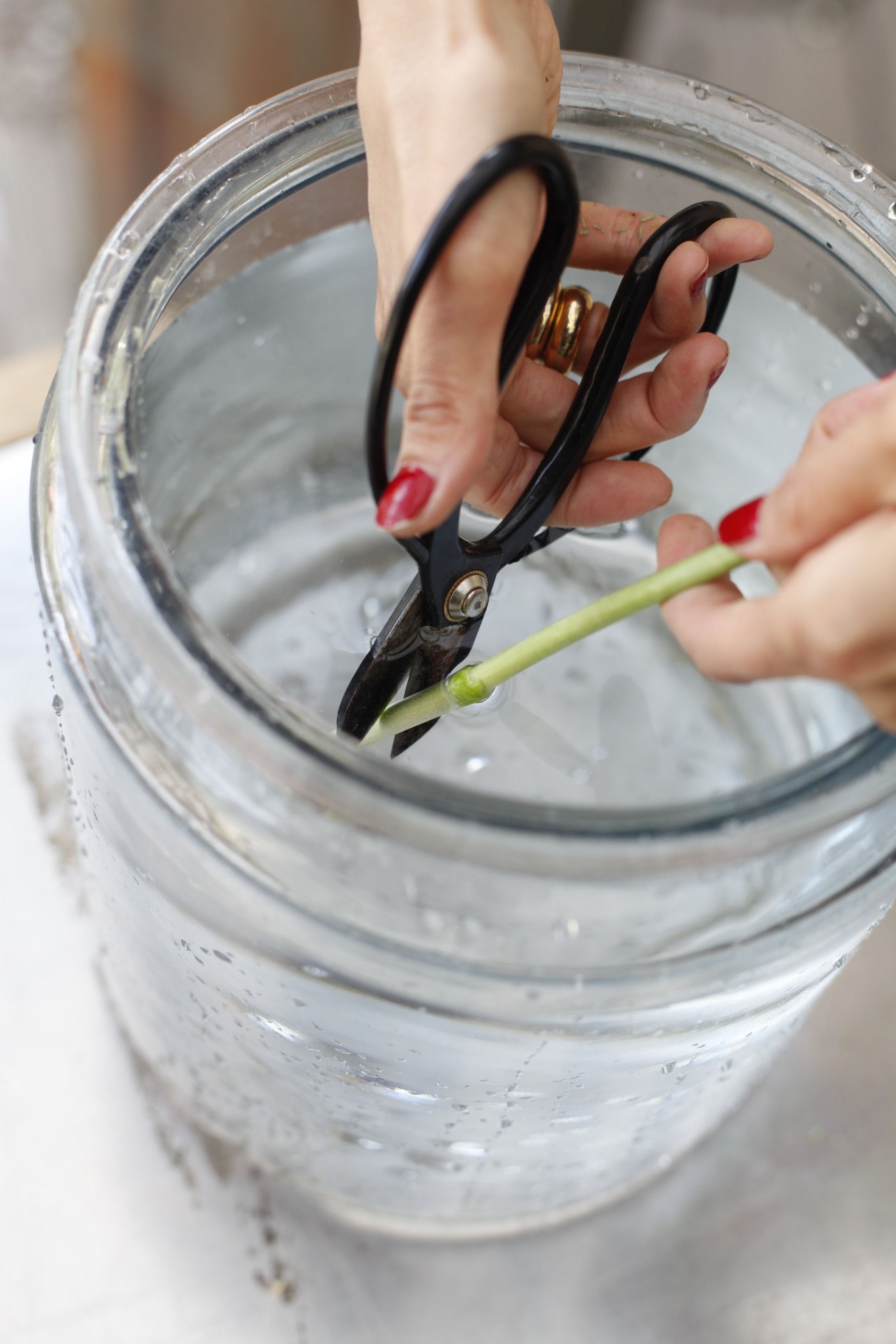 水切りは簡単です。大きめのボウルなどの器に水をたっぷり入れ、その中に茎を入れて、ハサミで茎先をカットするだけ。水を替えるたびに茎の先を1~2cm切ると、新しい導管の断面が常に水に接し、水があがりやすくなり、長もちすることにつながります。
