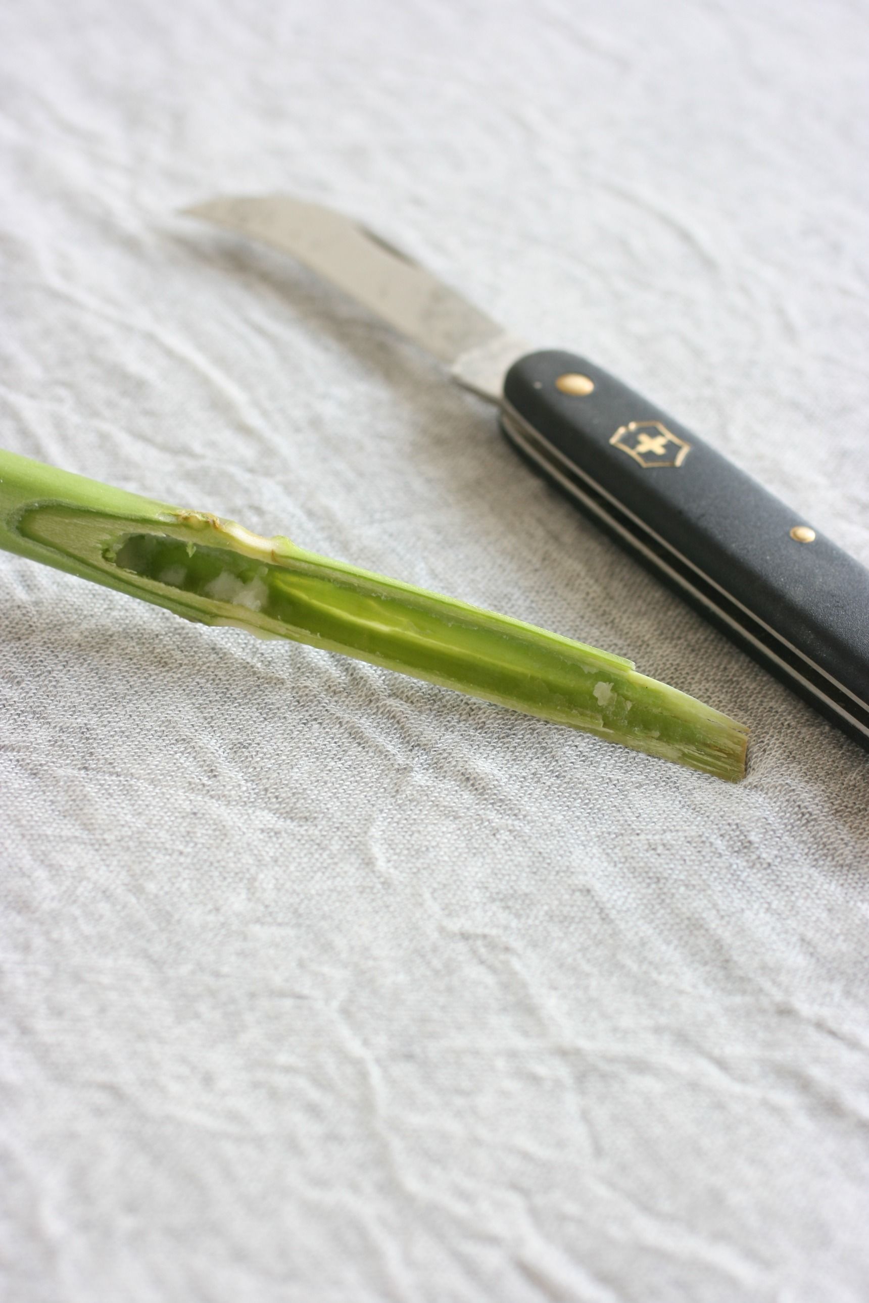 ハサミだけは必ず、花切りバサミを用意してください。普通のハサミで花の茎を切ると、前述した、水の通り道である“導管”が、つぶれてしまう可能性が大だからです。こうした理由から、花の茎をつぶさずにカットできるよう工夫された、花切りバサミが必要になります。花切りバサミを使っても、切れ味が悪かったり汚れていたりしたのでは、花のもちが悪くなるので注意しましょう。花切りバサミは使うたびに洗って汚れを落とし、しっかり水分を拭いておきます。