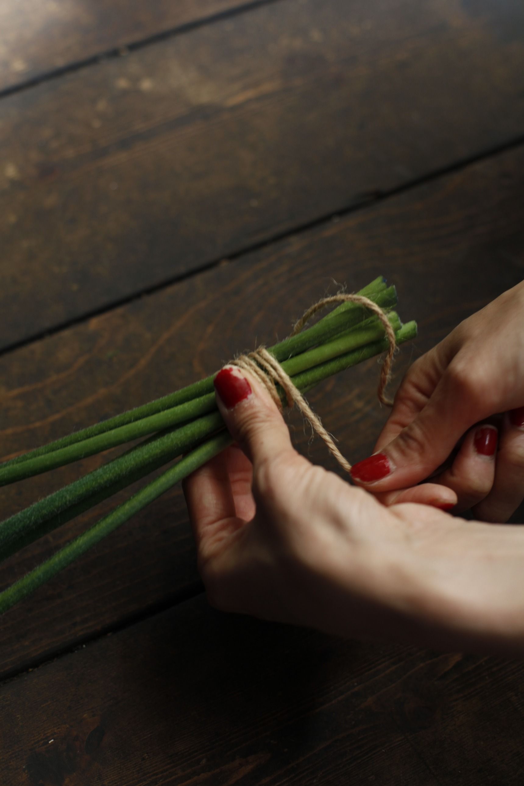②輪ゴムの上から麻紐をきつく巻きつけます。干すときに結びつけられるよう、紐の端は長めに残してカットしておきましょう。