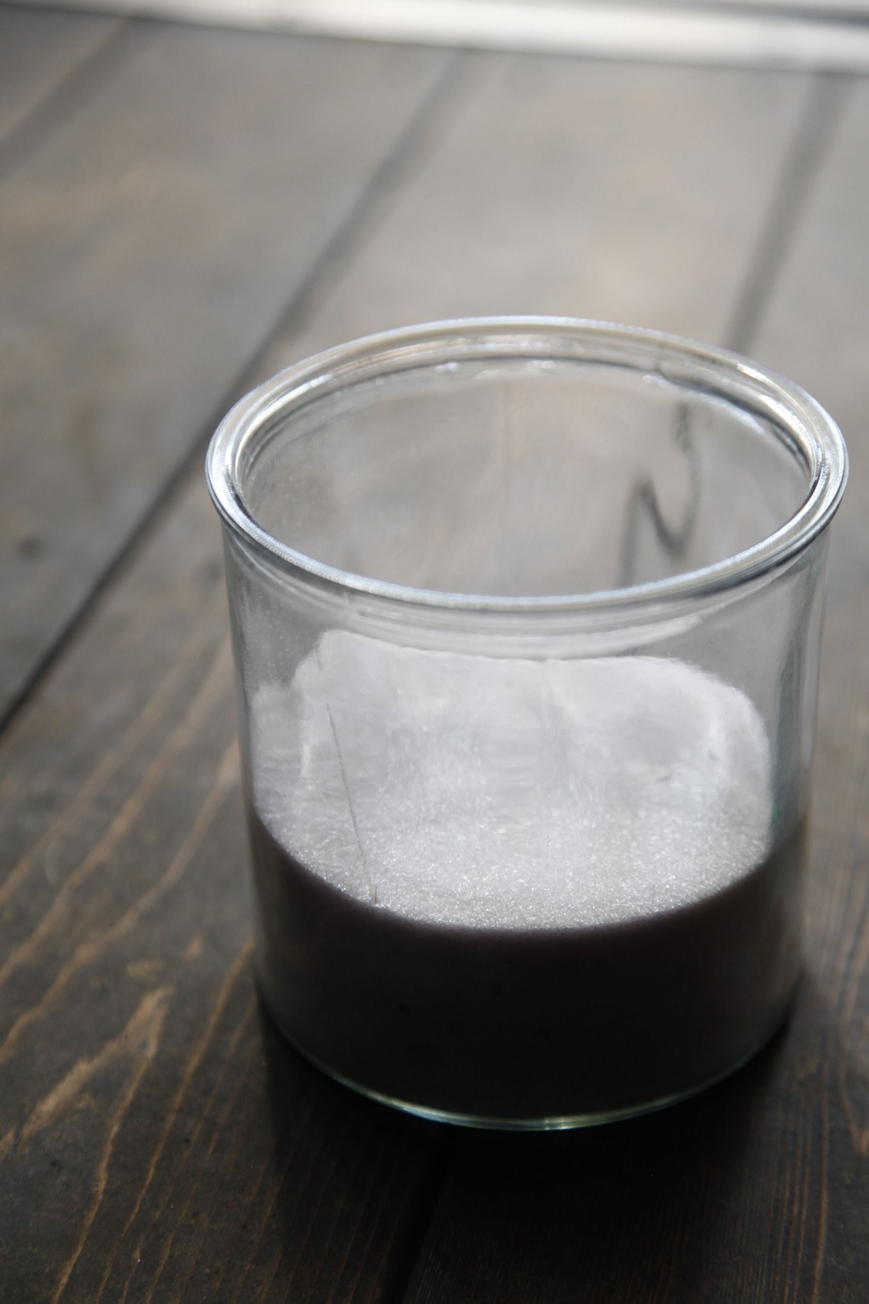 ①瓶にシリカゲルを敷きます。目安としては、花を入れたとき、花が瓶の中央に来るくらいの深さにしてください。