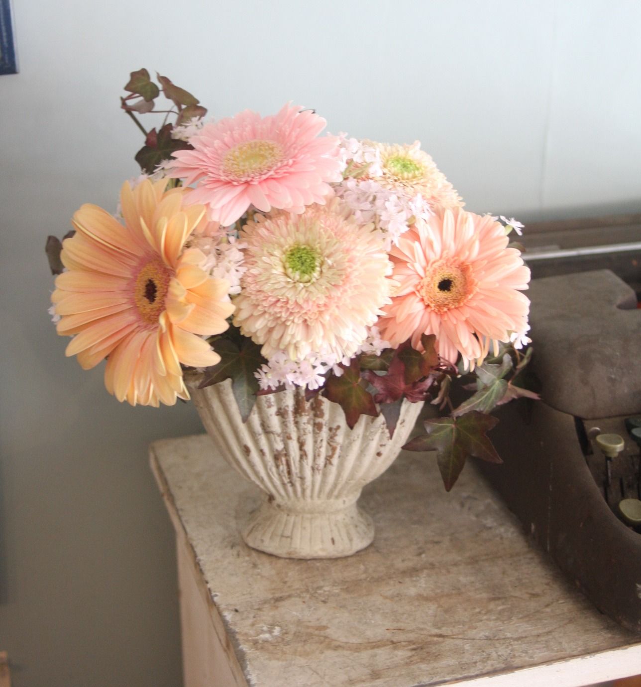 マットな質感をもつ、ふわっとしたパウダーカラーのガーベラを集めてアレンジしました。こんなニュアンスカラーであしらうと、ガーベラも柔らかでやさしい表情に。淡い色合いなので、若い方へお届けするお供えの花としても使えます。