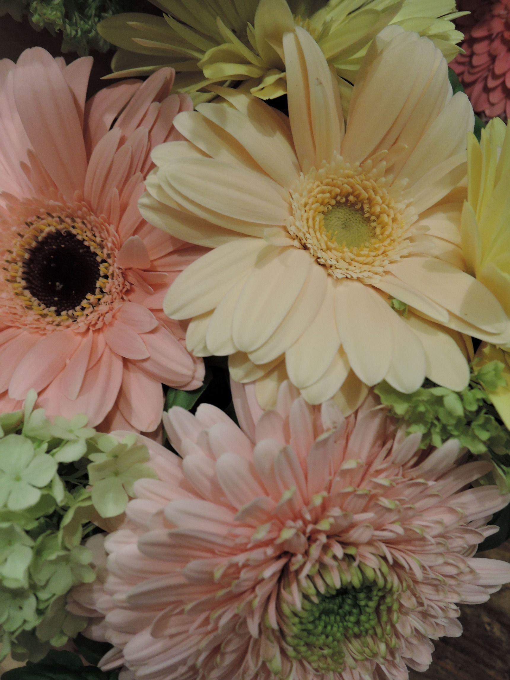 花材:ガーベラ3種、ビバーナム、ゼラニウム