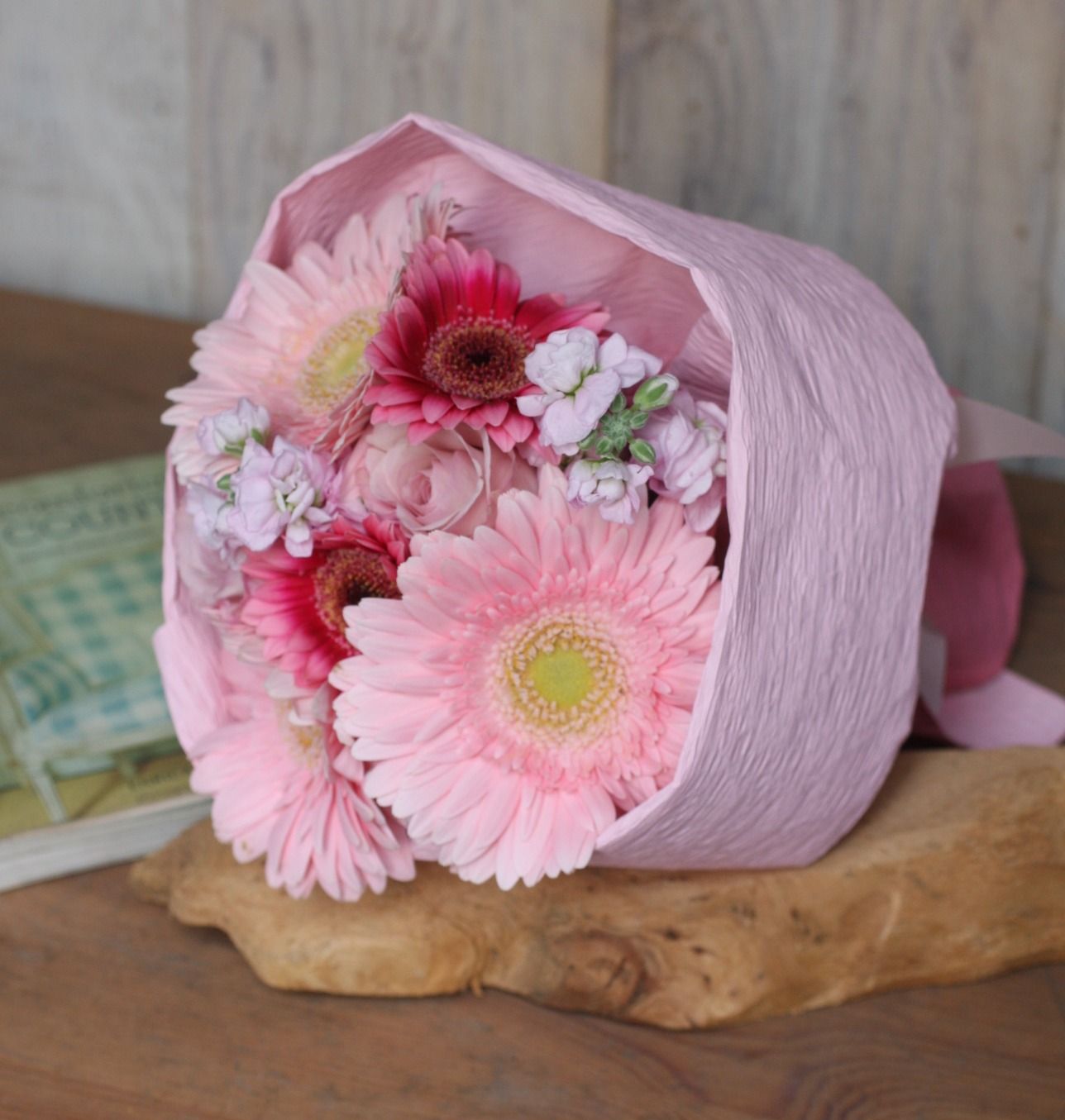 1輪1輪が大きく広がるガーベラなら、コンパクトで丸いパリ風花束にしても、ボリュームと存在感を放つことができます。華やかさがありながら気取りがないので、ちょっとしたお祝いのときにもさらりと渡せそう。