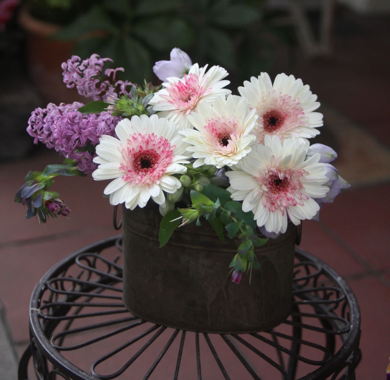 ガーベラはかわいらしすぎてちょっと…という大人の女性に贈りたい、しゃれたアレンジ。白にほんのりピンクがのった八重咲きの複色ガーベラに、落ち着いた紫色の花を合わせています。器のどっしりした渋い色で、淡い花色を引き立てて。