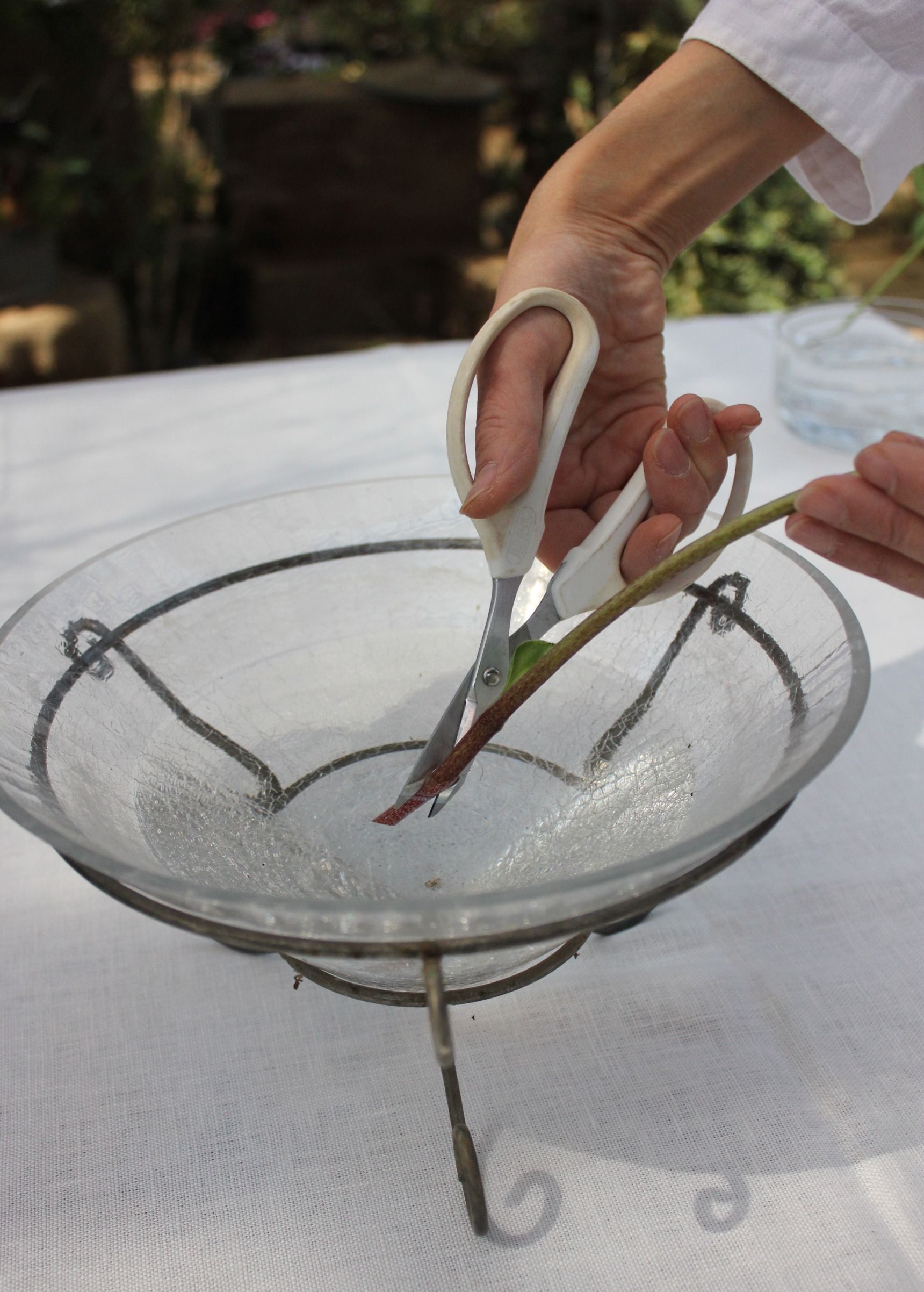 水切りは簡単です。大きめのボウルなどの器に水をたっぷり入れ、その中に茎を入れて、ハサミで茎先をカットするだけ。水を替えるたびに茎の先を1~2cm切ると、新しい導管の断面が常に水に接し、水があがりやすくなり、長もちすることにつながります。