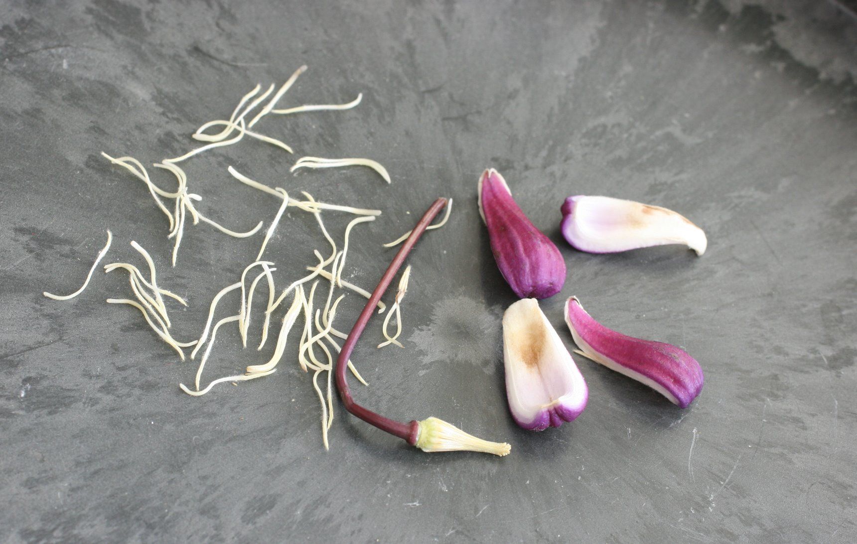 クレマチスを花器などに挿すときは、花の部分にはノータッチ! 茎を持って挿してください。写真は、花びらが落ちたので、分解した様子です。可憐なベル形の花びらは、意外に厚いんですね。チークブラシみたいに束になって、中に抱えていた雄しべも、こんなに多数。