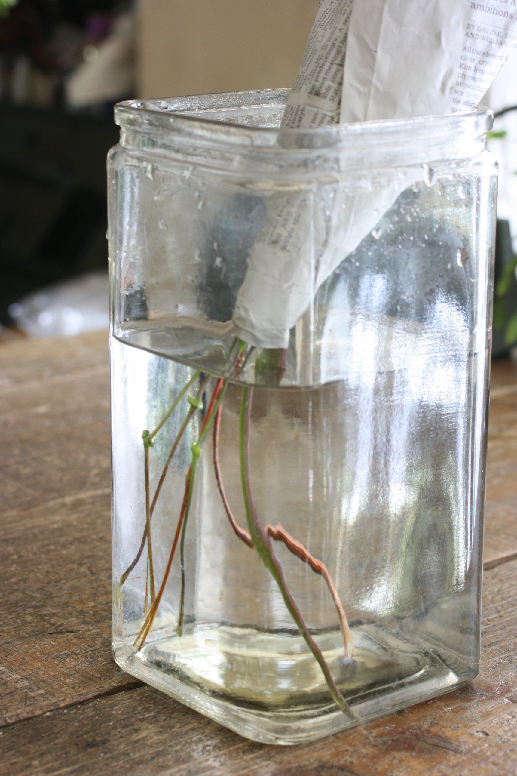 叩いて箒状になったら、花や葉が隠れるように新聞紙でくるみ、深く張った水で1時間以上、休ませます。これを「深水(ふかみず)」といいます。