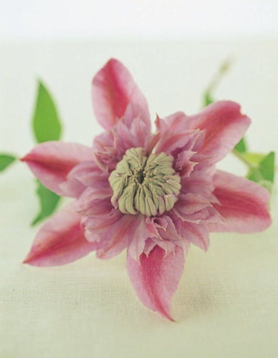 葉の美しさもクレマチスの魅力です。なかでもベル形タイプの葉は、こんなにもかわいらしく、爽やかな緑色。ふわりと軽やかに踊るラインも素敵ですね。わずか2本の花でも、葉をつけたままいけると、ほかには何もいらないくらい、自然な雰囲気で楽しめます。前述したように、花により多くの水が届くように、生かしたい葉だけを残して飾りましょう。