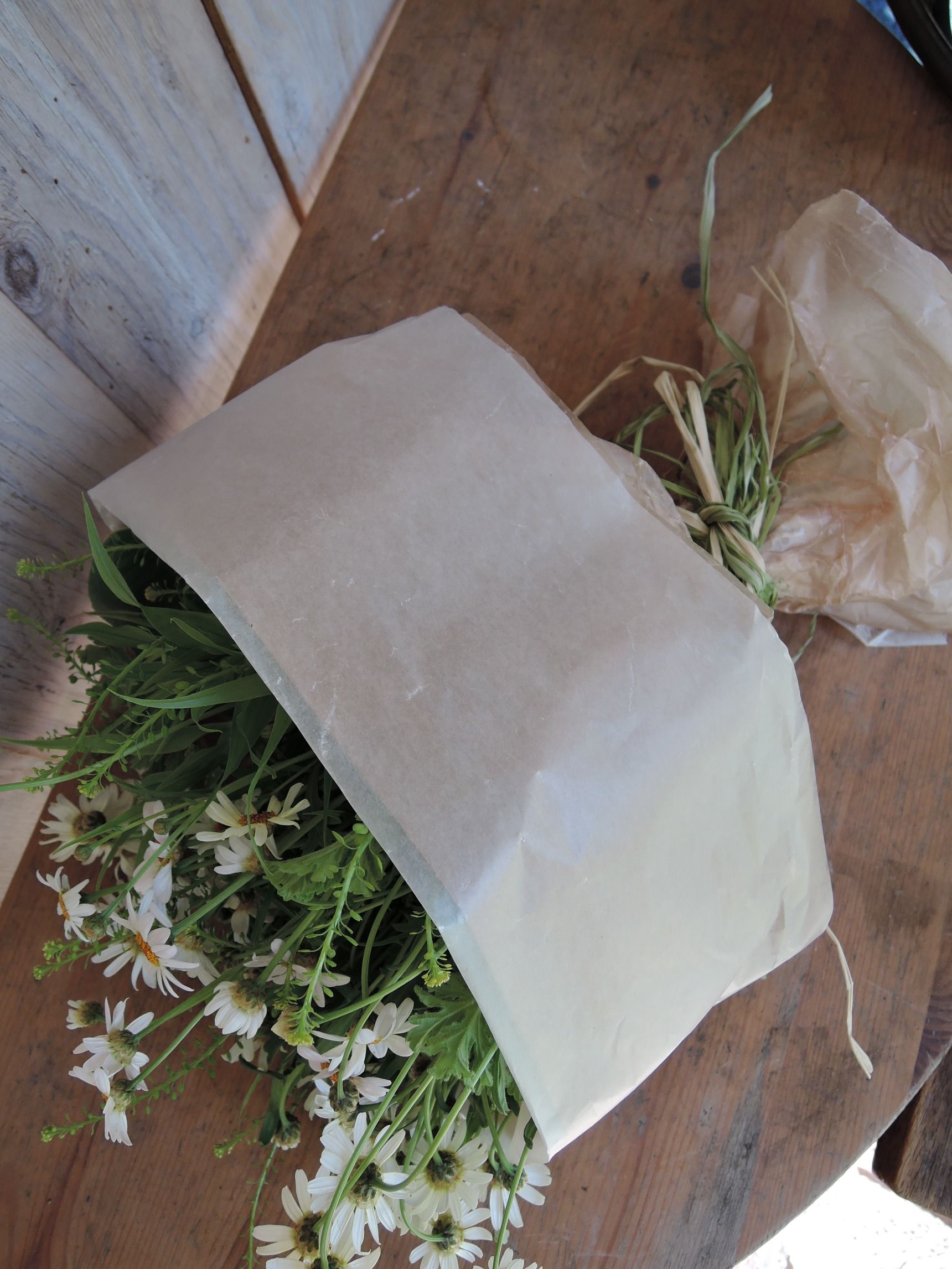 白いマーガレットにグリーンを添え、英字新聞でささっとくるんだ、1000円以内で作れる気軽な花束。お菓子を贈るときなどにちょっと添えたり、贈りもののお礼に渡すなど、かしこまらない花贈りにぜひ。