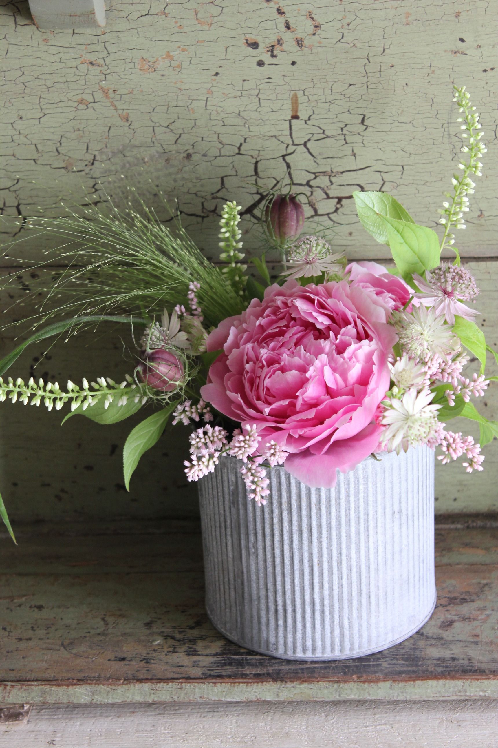 シンプルに、シャクヤク1種類だけをまとめても、咲いたものとつぼみの、色のグラデーションが楽しめます。