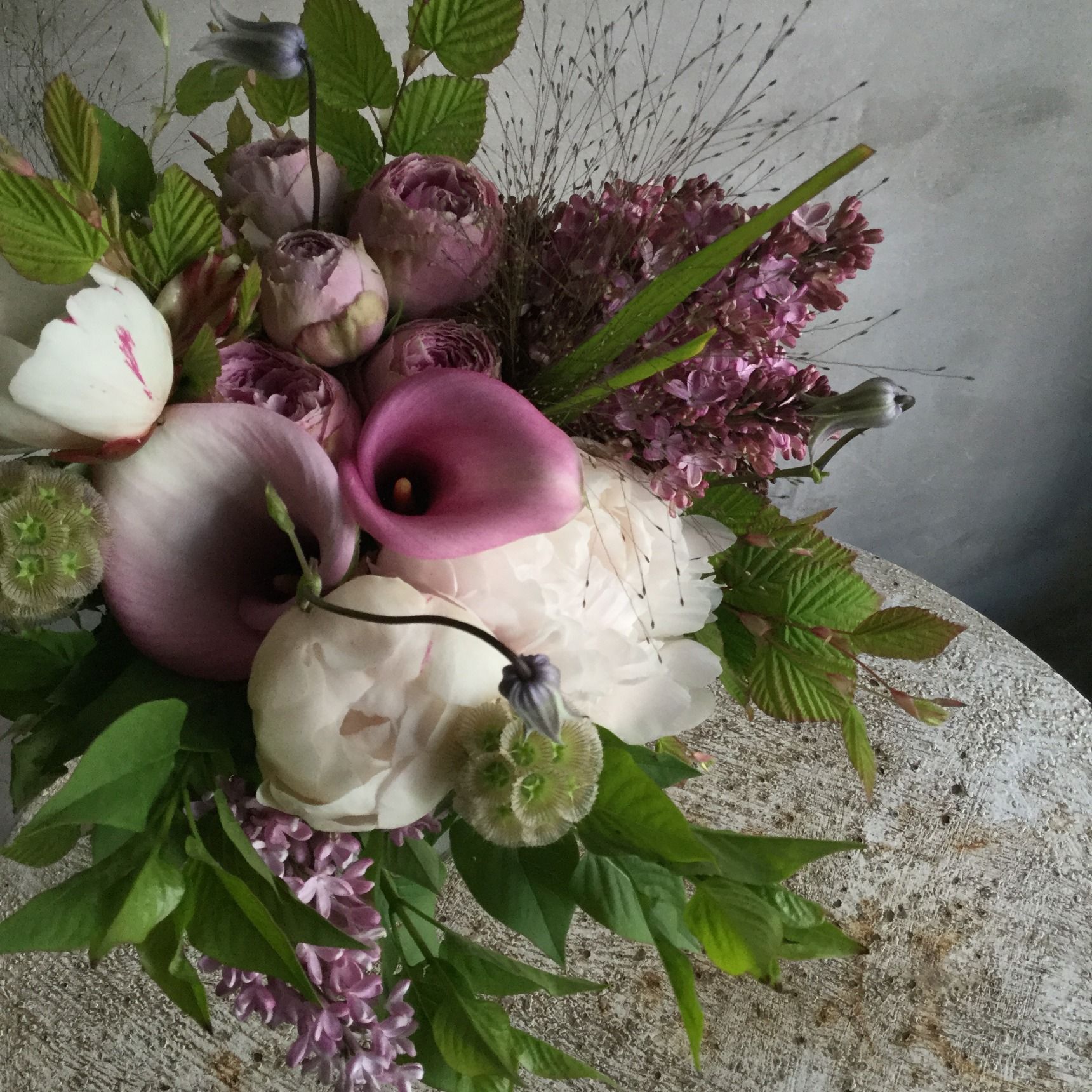 花材:シャクヤク(かぐや姫)、ライラック、カラー、バラ(ラベンダーレース)、ステルンクーゲル、スモークグラスなど