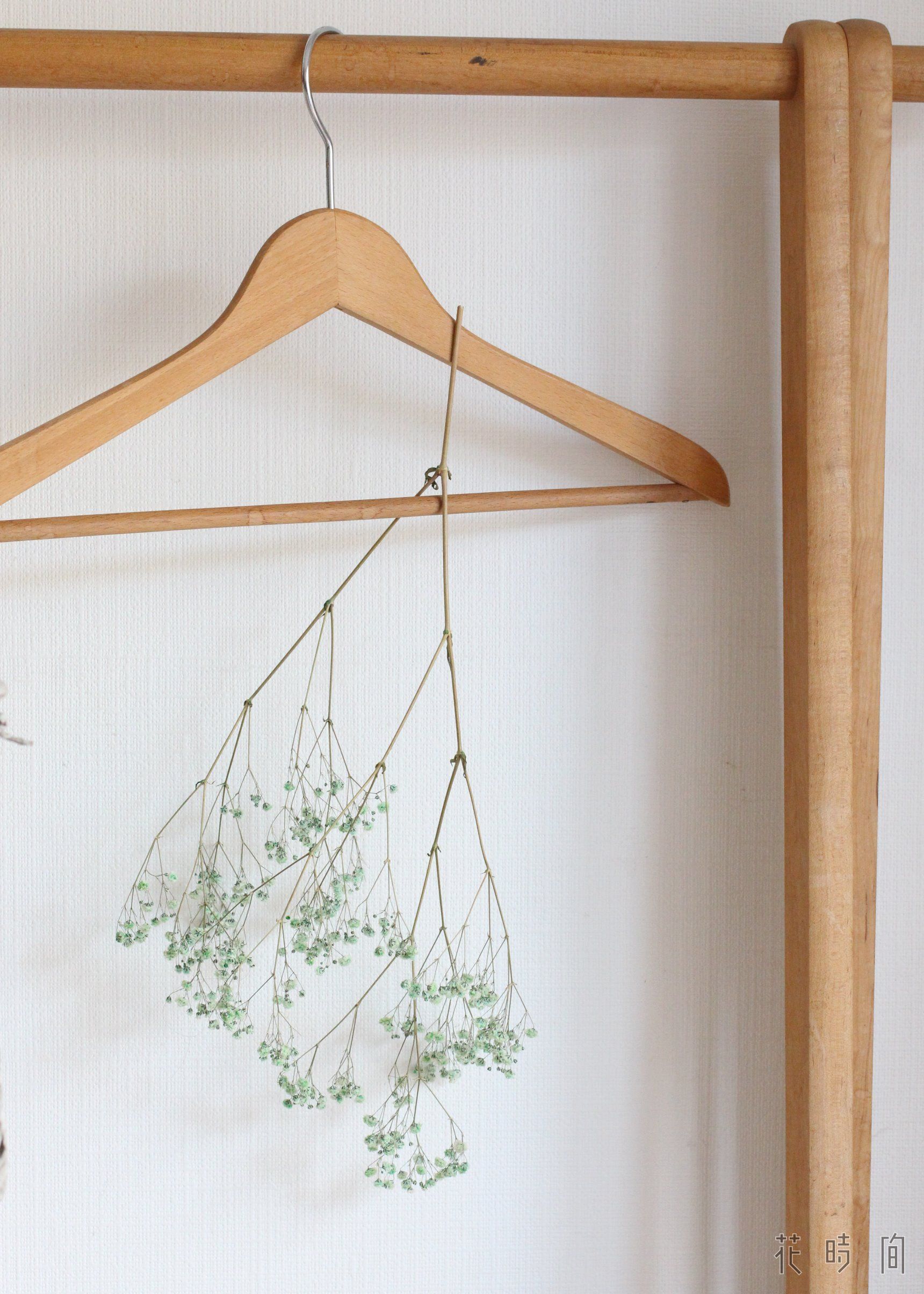 いずれの場合も、通気性がよく、早く干し上がります。ほかに、突っ張り棒で廊下などに吊るすのも一案です。その場合は、通るたびにぶつからないよう、カスミソウは高い位置に吊るすこと。