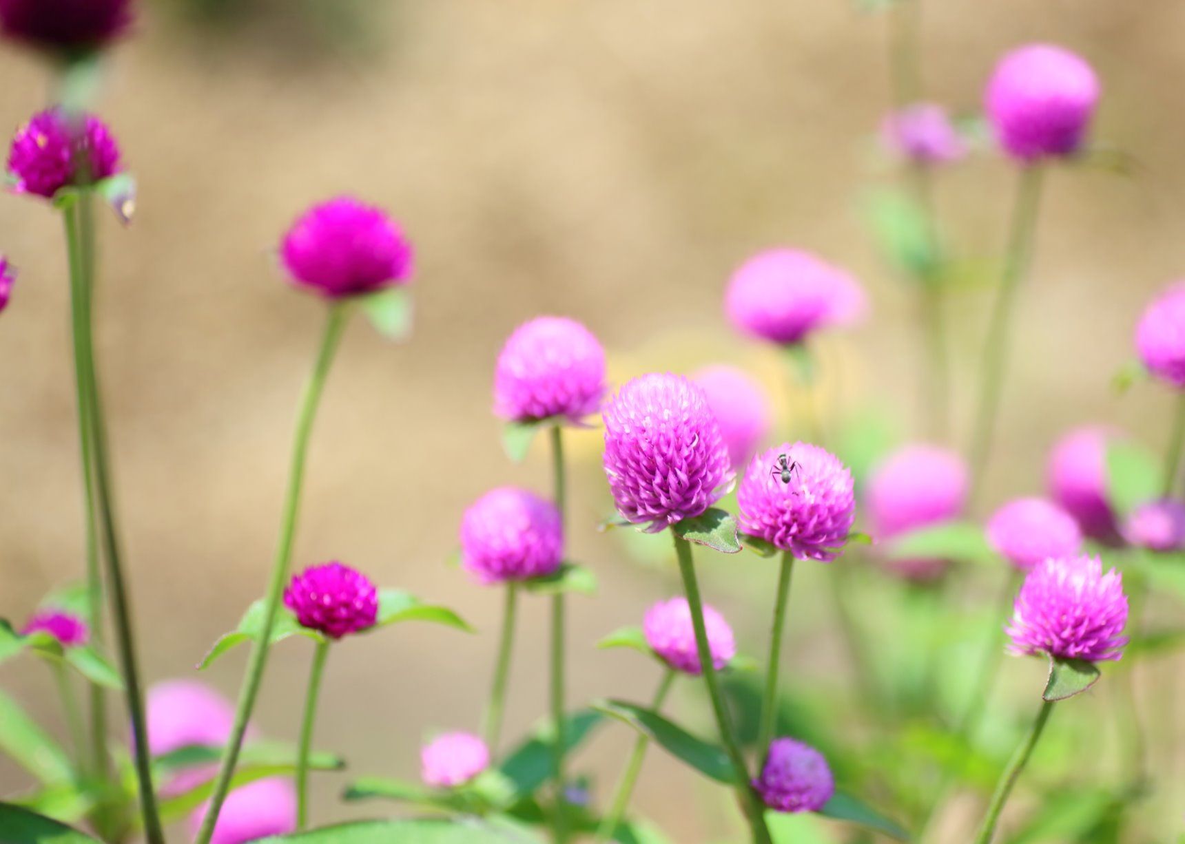かわいらしいアクセントに重宝するのは、センニチコウ。水にいけたままにしていても、いつの間にかドライフラワーになっています。干し上がっても、色の美しさを保つ便利花材。ピンクのほか、白、紫に近いピンク、赤い花があります。