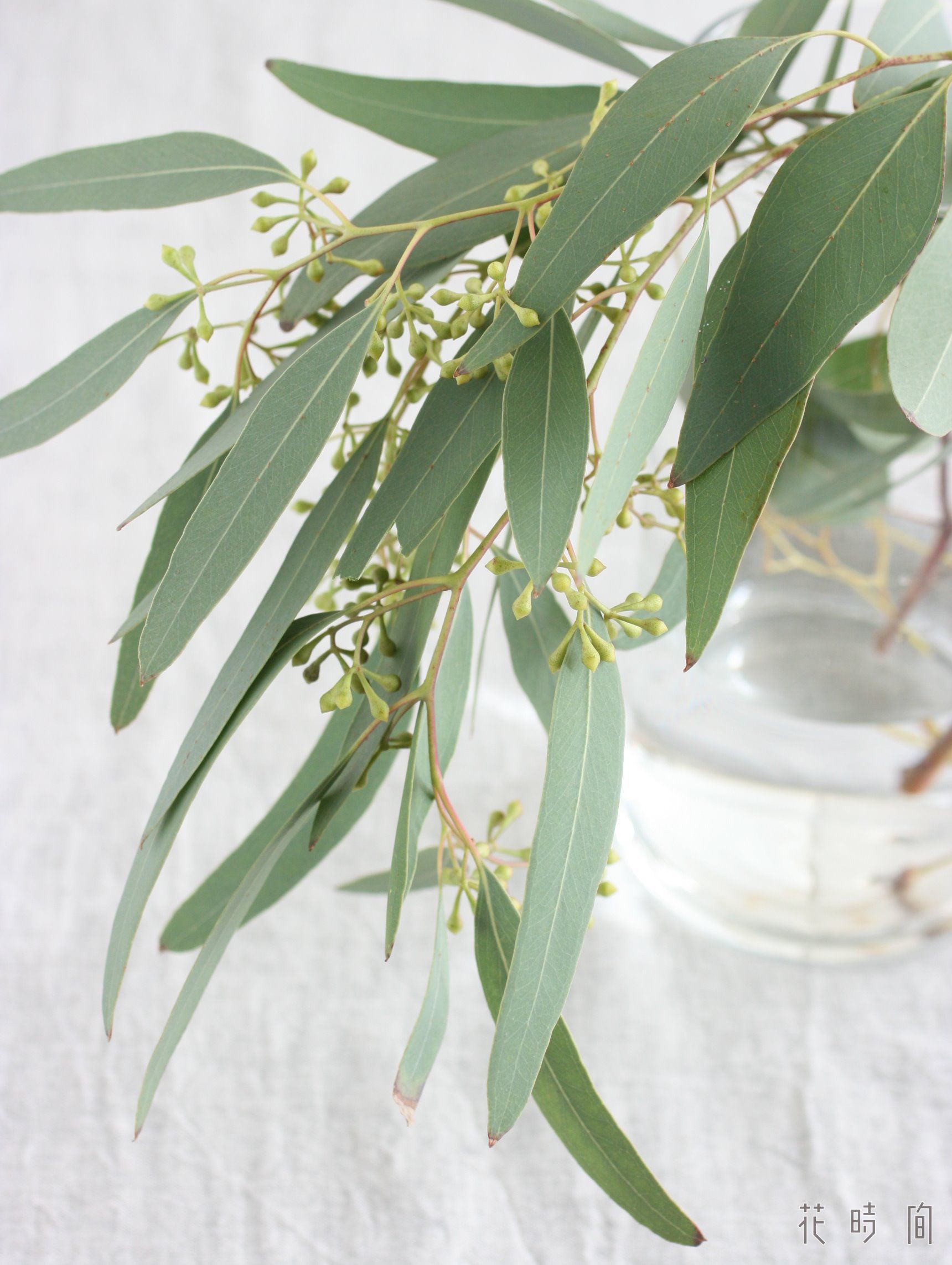 グリーンを合わせてスワッグに仕立てるなら、葉がほっそりしたタイプのユーカリを。茎が細いものを選ぶと、カスミソウに寄り添うようにしなります。実つきを選ぶと、表情がさらにナチュラルに。
