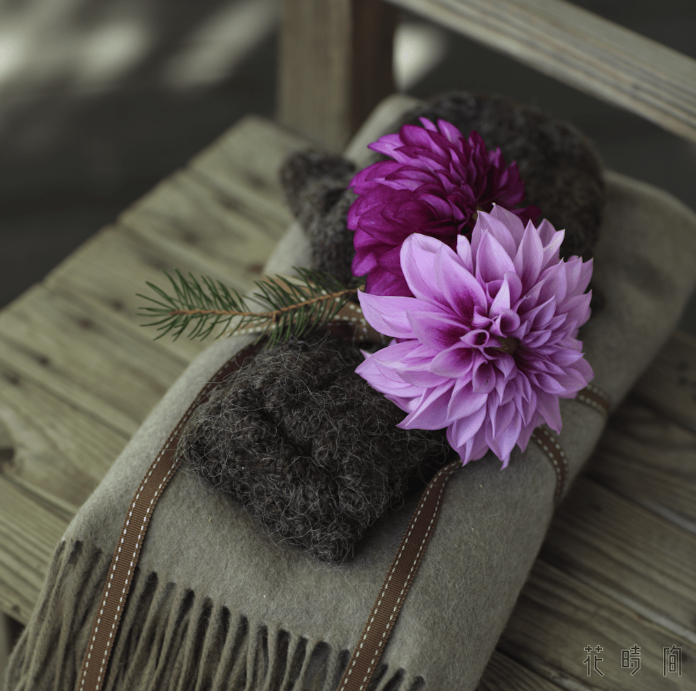 花材:ダリア(ブルーライト、アトム)、モミノキ 撮影:山本正樹ダリアは、寒い時期には水から上げても意外にもちのよい花。コサージュに仕立てて、贈り物に添えてみましょう。