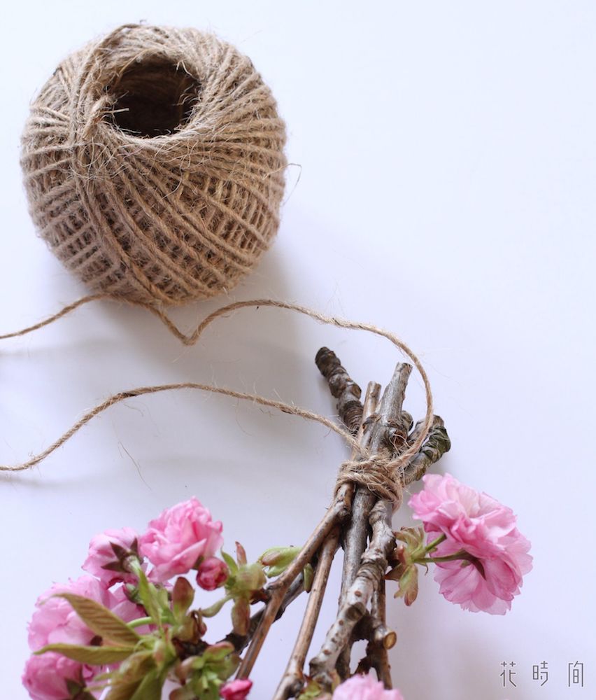 サクラは、乾燥するにしたがい、茎からも水分が抜け、細くなります。しっかり縛ったつもりでも、縛り方が緩いと、干している間にするっと花が抜け落ちてしまうことも。輪ゴムでいったんまとめてから、麻紐をきつく巻きつけましょう。